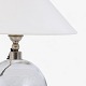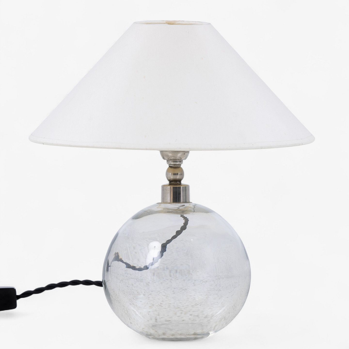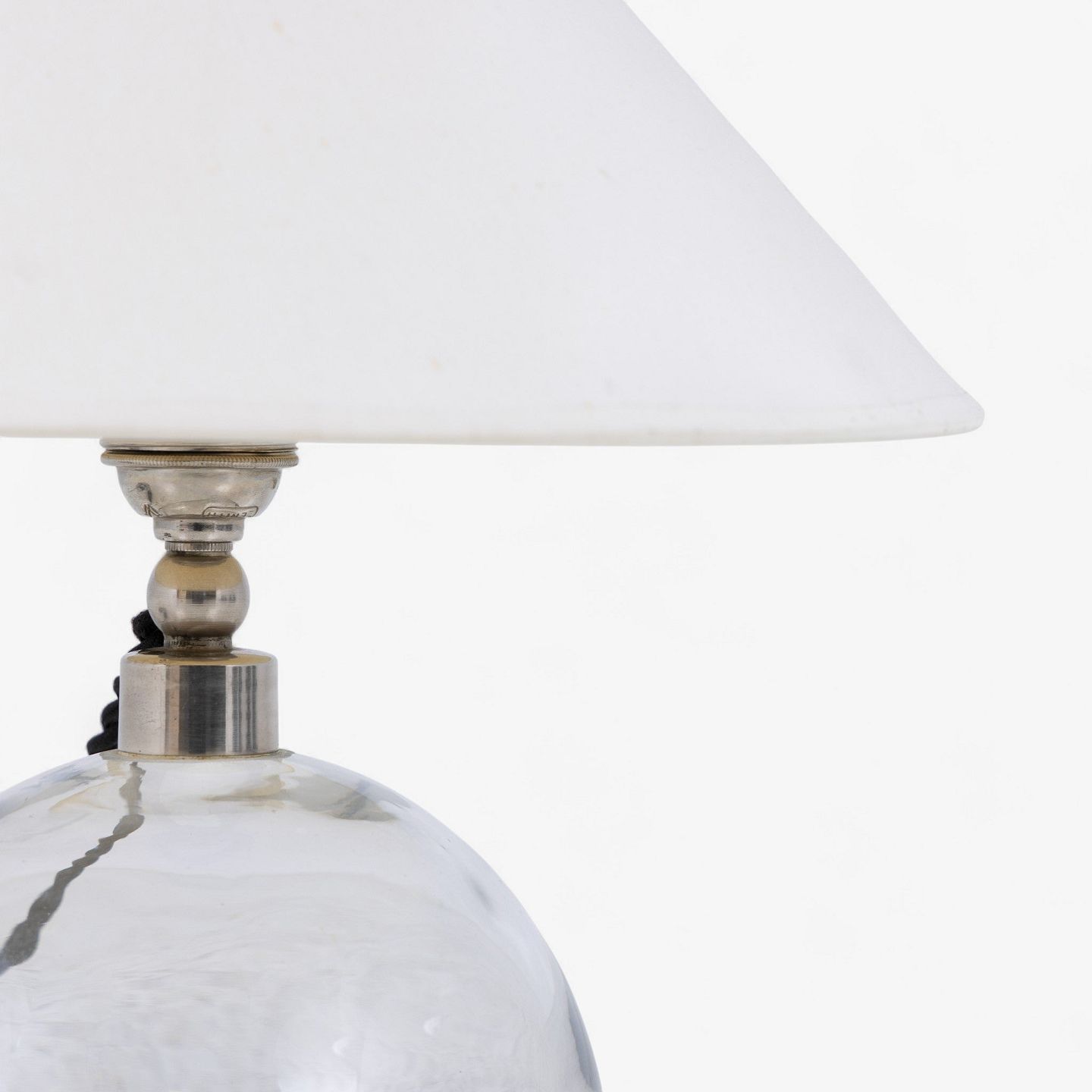 Kugleformet bordlampe i mundblæst glas med hvid skærm.
