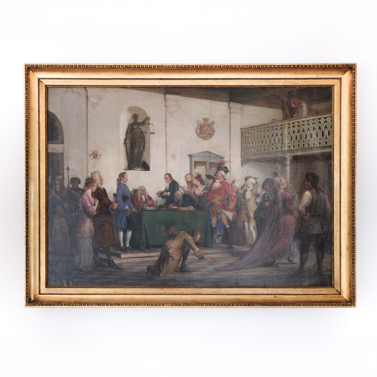 Beskrivelse: Olie på lærred tilskrevet Wilhelm Marstrand (1810–1873), udført som en scenisk fremstilling af afslutningen på Ludvig Holbergs komedie “Det Lykkelige Skibbrud”. Maleriet er usigneret og måler 95 x 135 cm. Ny Carlsberg Glyptotek ejer en anden version af motivet (90 x 127 cm), hvor både interiør og de afbildede personer adskiller sig fra dette eksempel. Nivaagaard ejer desuden en skitse til scenen, som viser både ligheder og variationer i forhold til de to malede versioner.