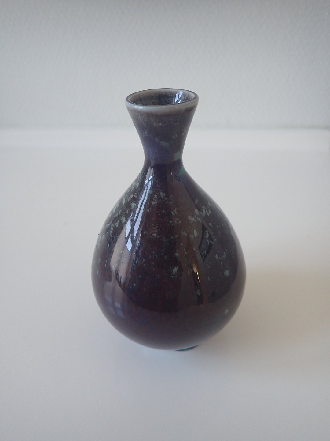 Beskrivelse: Berndt Friberg (1899 - 1981) - Lille, dråbeformet vase i stentøj med blank grøn/brun/blå spættet glasur. Gustavsberg. Stemblet Friberg 79. Højde: 11,7 cm. Bredde: ca. 7 cm. I fin stand men med oprindelig sleben bund.