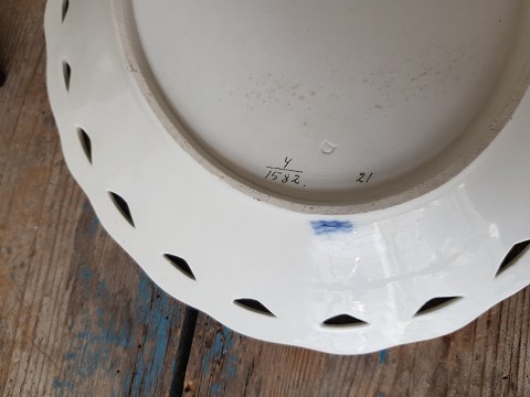 Royal Copenhagen Fuld Saksiskblomst fad med gennembrudt kant No. 1582, 1. sort. Produceret mellem 1850-1898 Mål 25,5 x 30,5 cm.
