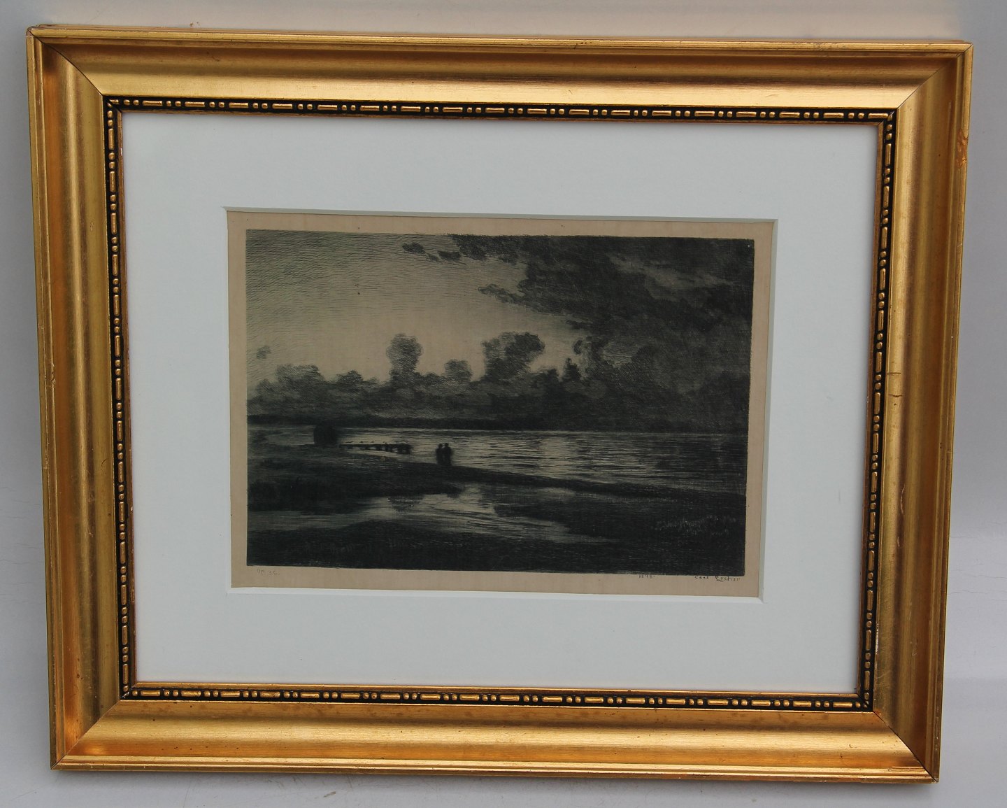 Radering: Carl Locher 1898 Aftenstemning ved søbredden 29.5 x 25.7 cm inklusiv ramme