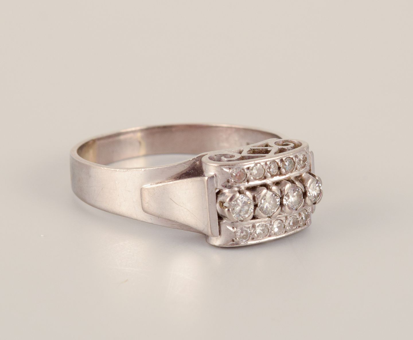 Swedish vintage 18 karat diamond ring in white gold adorned with four large diamonds and ten small diamonds. Classic Art Deco style. Gothenburg goldsmith.