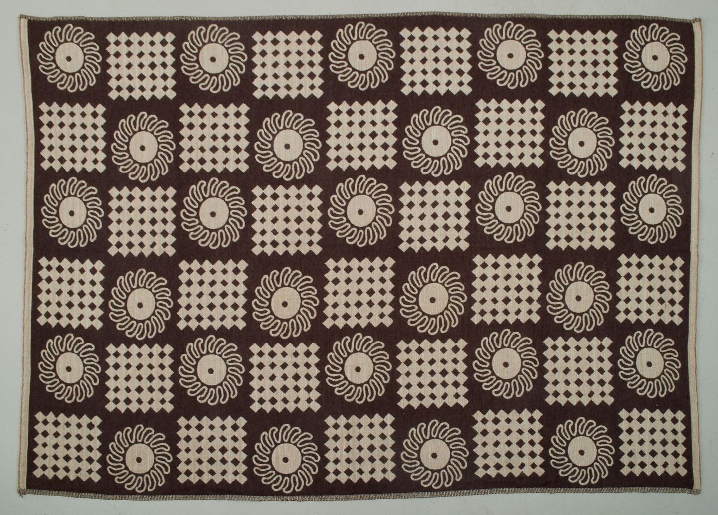 Large handwoven wall tapestry in pure wool. Geometric fields in brown and white.