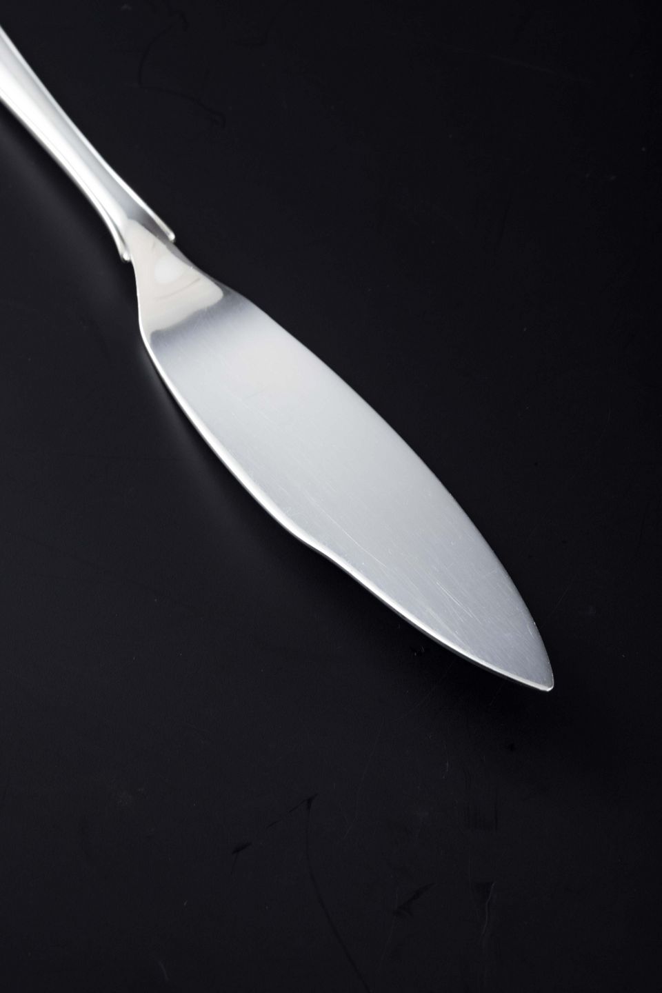 Fish knife in the “Lily of the Valley” pattern. Mirror-polished sterling silver, with an elegant handle termination featuring a discreet flower and leaf motif.