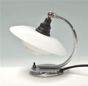 Natbordslampe af forniklet metal, monteret med Poul Henningsen PH 2/1 pendel, skærmsæt af hvide opalglas, stofledning. 23 x 20 cm. Fremstår i god stand.