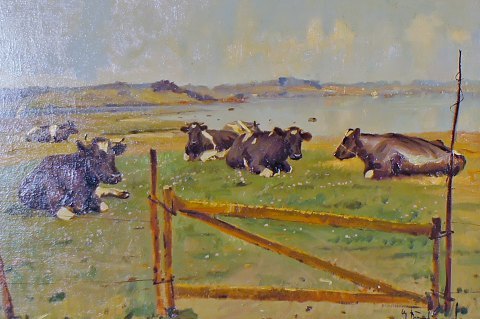 Gunnar Bundgaard (f. Aalborg 1920, d. 2005) : Køer på marken. Signeret, G. Bundgaard. Olie på lærred. 80 x 63. I god stand. Guldrammen er 10 cm. bred.