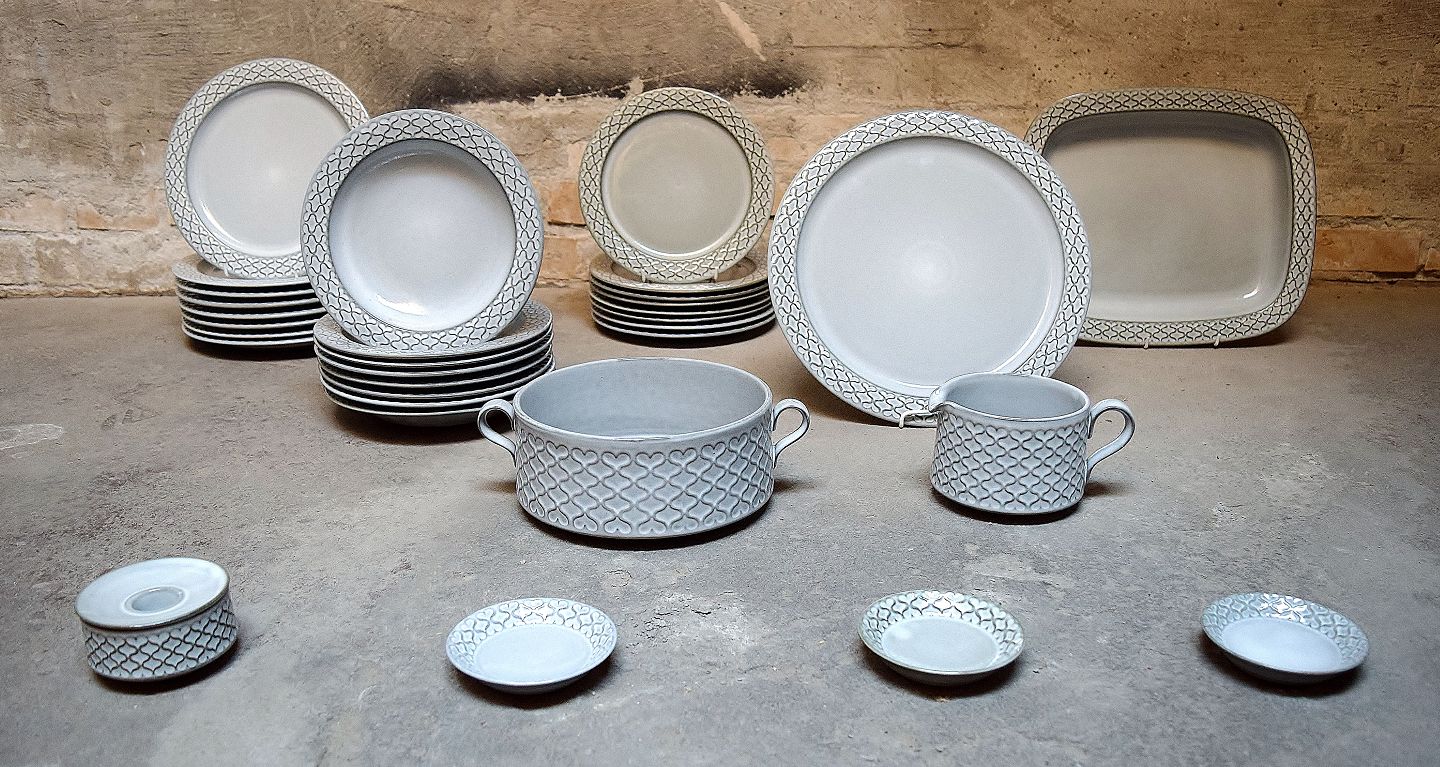 Consisting of: 8 + 8 + 8 dinner / lunch / soup plates, large round platter, large deep dish, bowl with handles, sauceboat, 3 small plates, candlestick, a total of 32 parts.