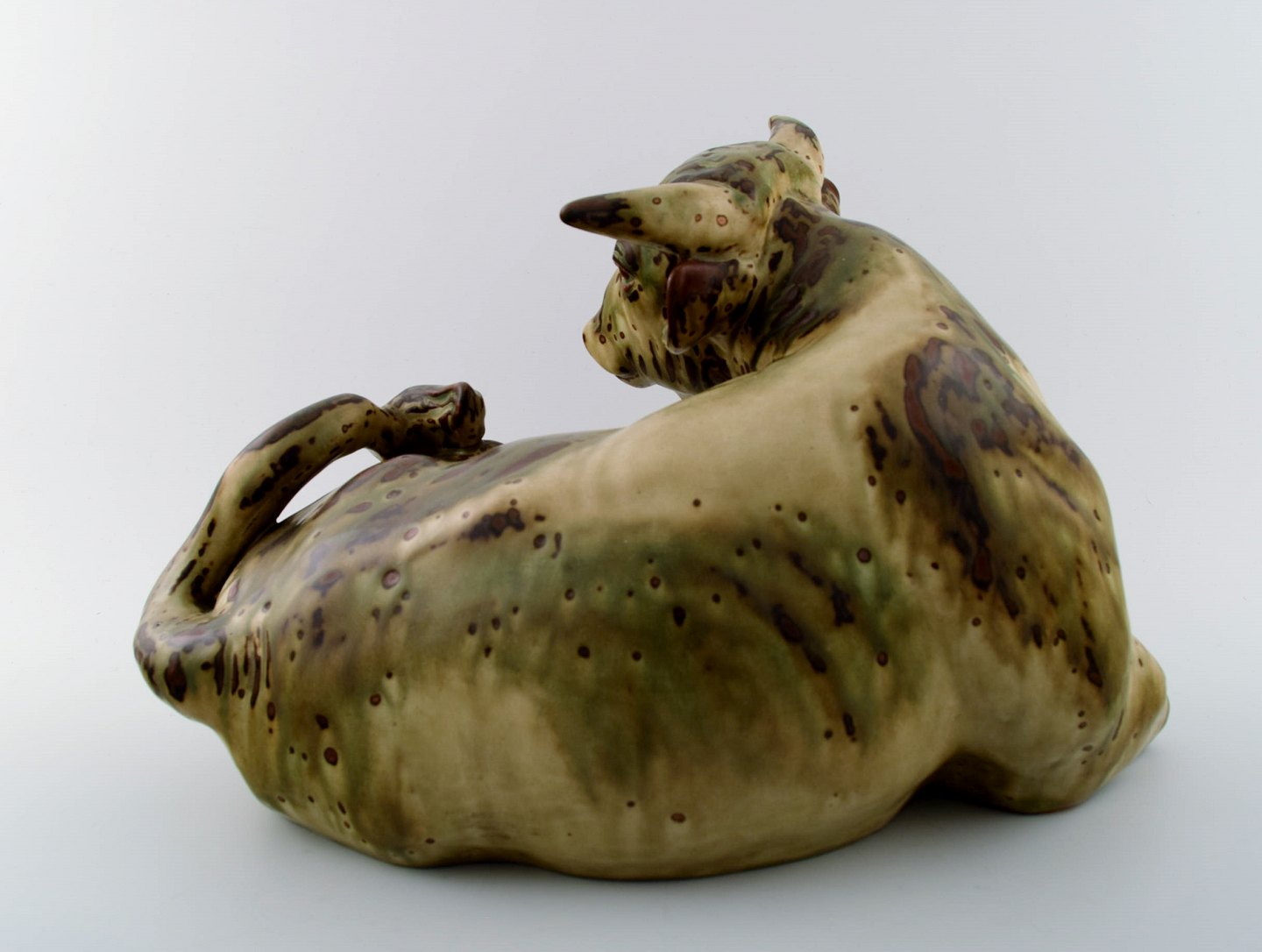 Royal Copenhagen stentøj nummer 2595 stor tyr. Sung glasur. Måler 25 x 36 cm I perfekt stand. 1. sortering. Stemplet.
