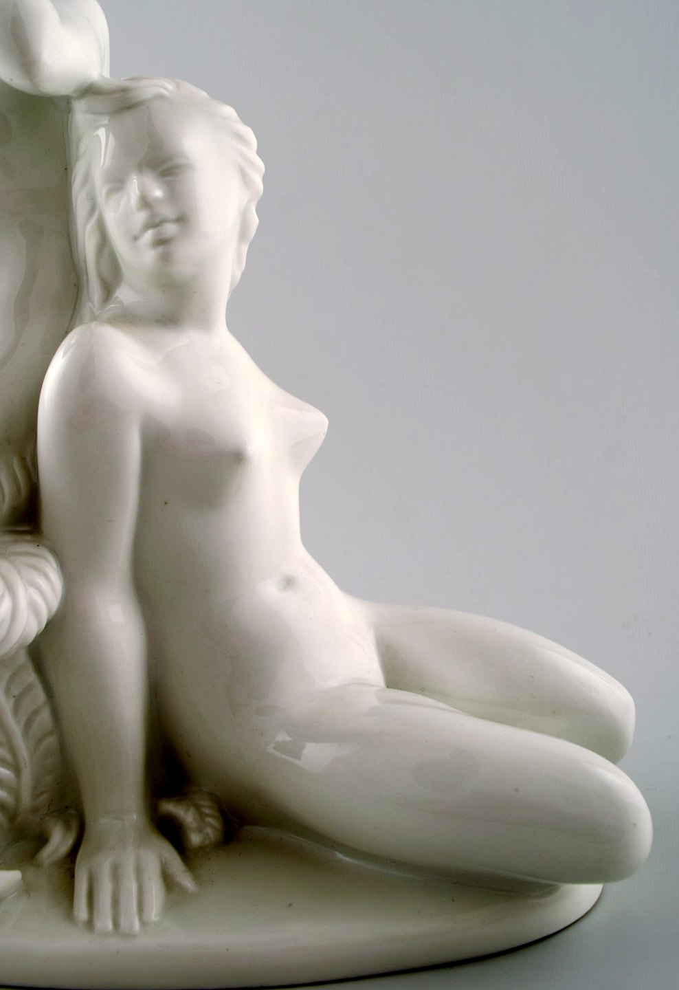 Harald Salomon for Rörstrand, hvidglaseret Art deco figur forestillende nøgen kvinde og fløjtespillende pan. Stemplet. I perfekt stand. Måler : 25 cm. x 25 cm.