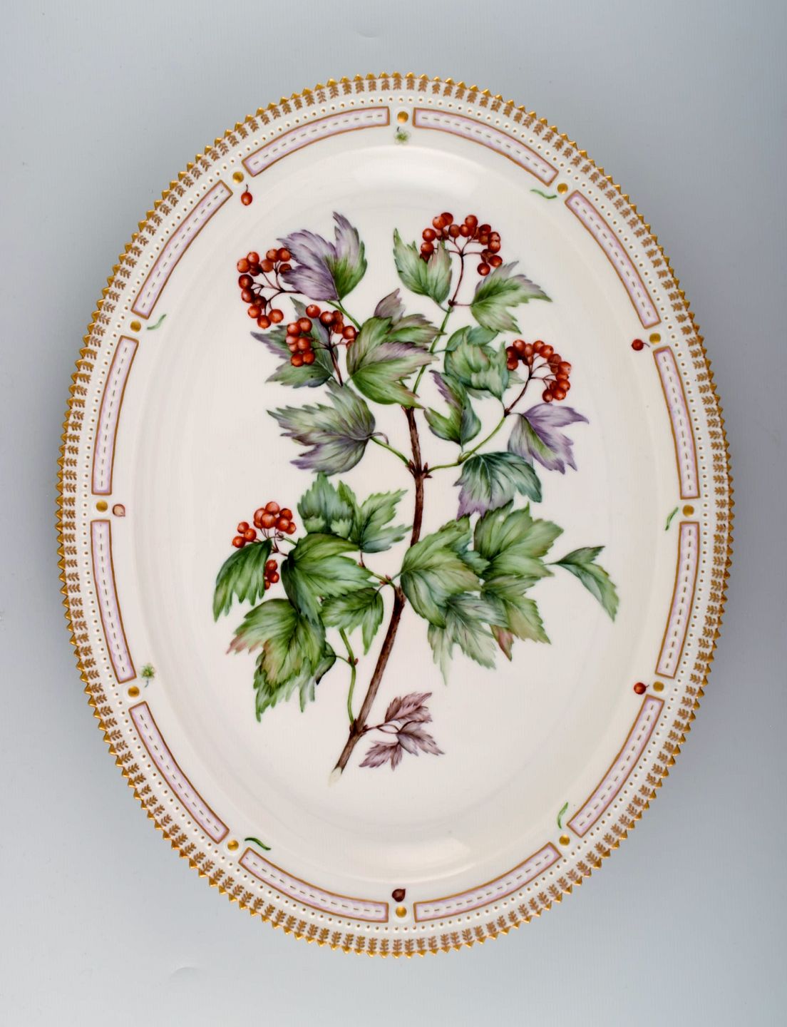 Royal Copenhagen flora danica stort ovalt serveringsfad #20/3519. Måler 44 cm. x 33 cm. 2. sortering, perfekt stand. Stemplet, dateret 1933. Hjemmedekoreret.