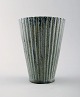 Arne Bang. Keramikvase i rillet stil. Stemplet. Smuk glasur i grønblå nuancer. I perfekt stand. Måler 13 cm. x 9 cm.