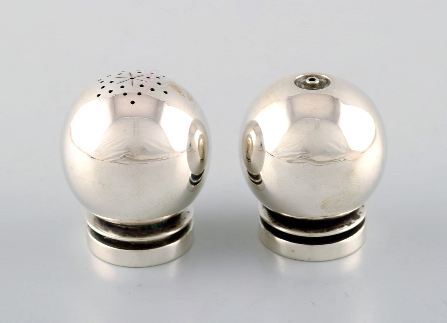 Georg Jensen "Pyramid" art deco salt & pepper set in sterling silver. Designed by Harald Nielsen (1892-1977) in 1930. Measures: 4.7 cm x 4 cm. Early stamp: 1933-1945 In very good condition.