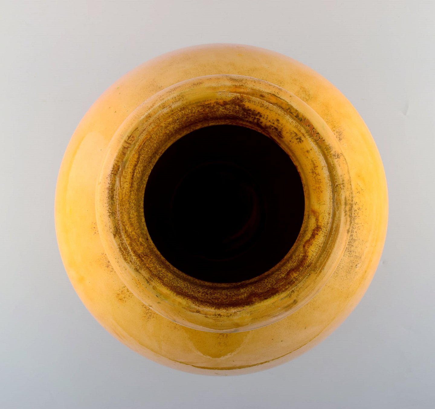 Stor Kähler, HAK, Svend Hammershøi, glaseret gulvvase i stentøj. kuglerund form. I perfekt stand. Flot urangul glasur. Stemplet. Måler: 34 cm x 34 cm.