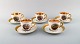 Royal Copenhagen kaffeservice. Komplet til fem personer med tilhørende tallerkener, samt to bouillonkopper. klassicistiske scener og dekoration i bladguld. Midt 1900-tallet.
