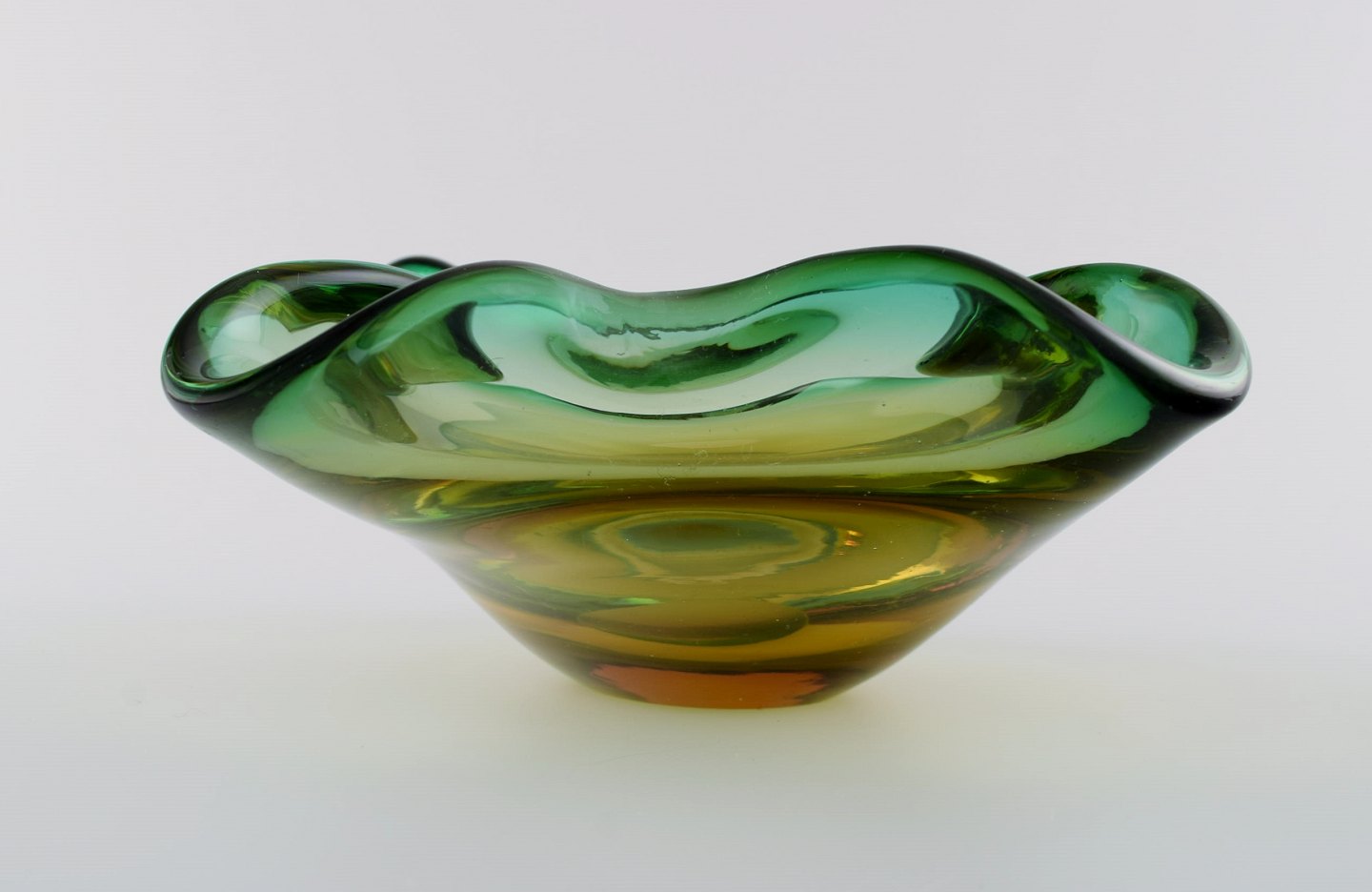 Murano bowl in greenish mouth blown art glass. Italian design, 1960s. Measures: 20 x 8.5 cm. In perfect condition.