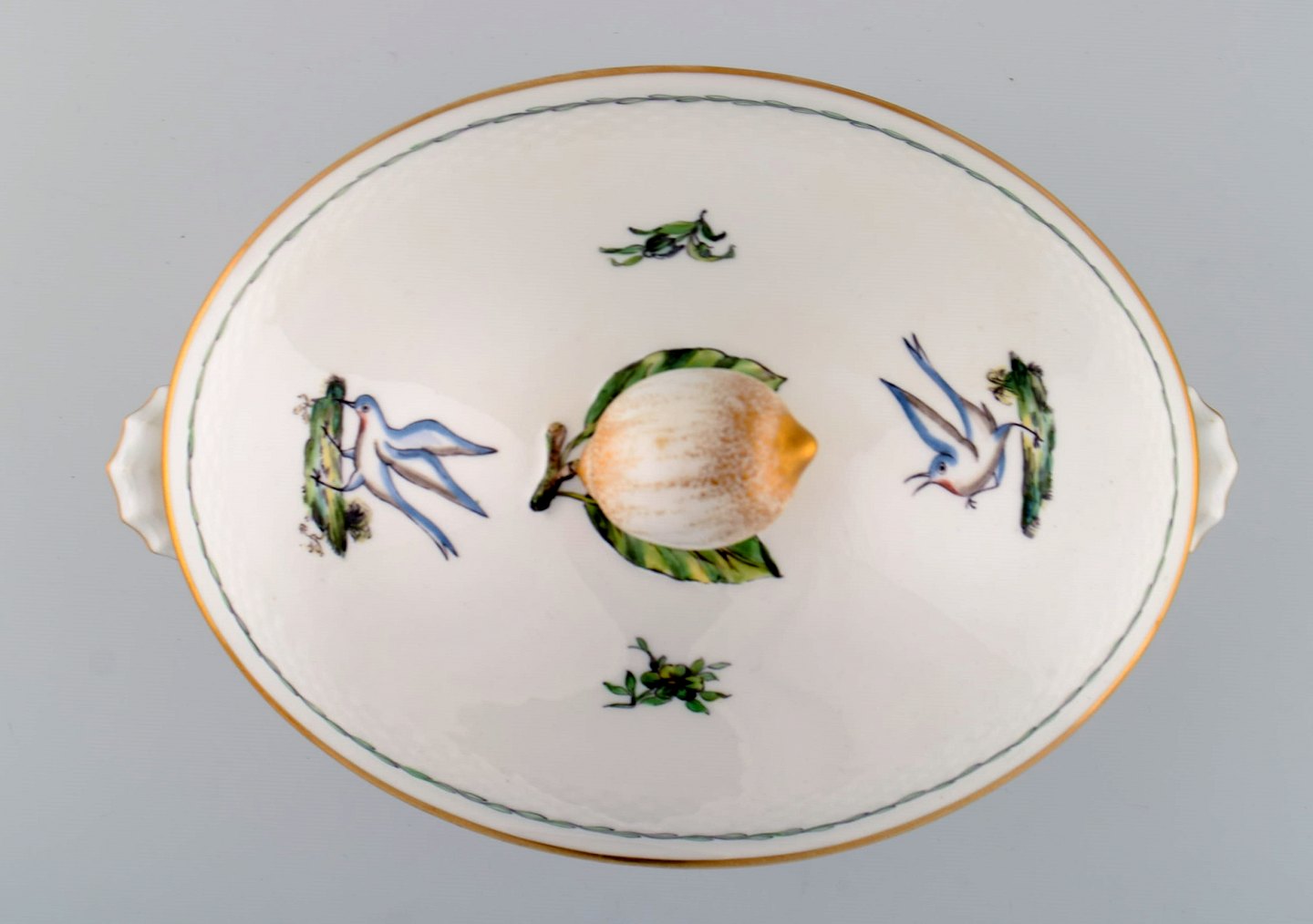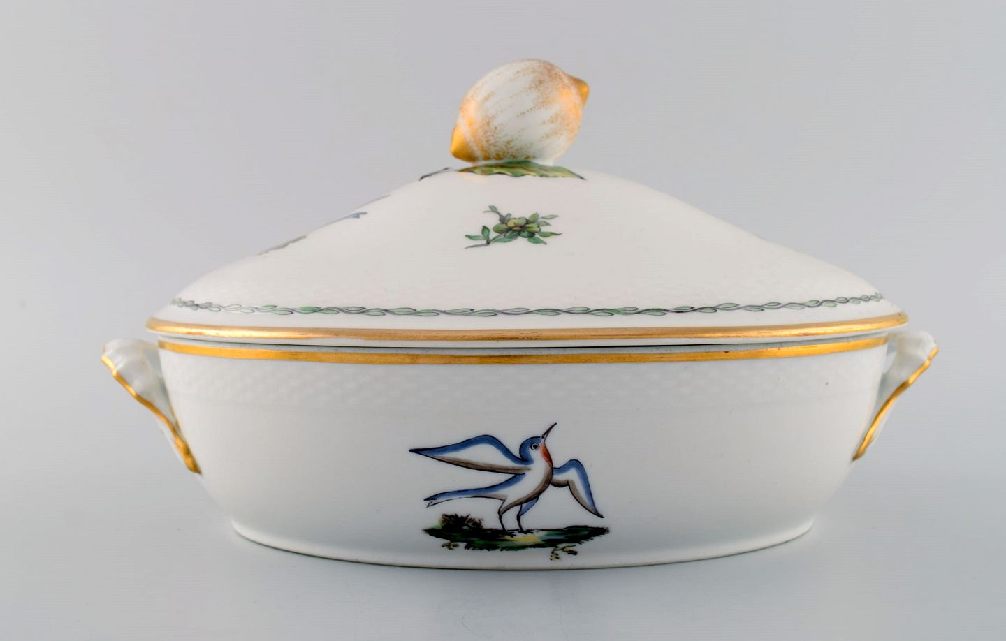 Royal Copenhagen lidded tureen in hand-painted porcelain with bird motifs and gold decoration. Early 20th century. Measures: 27.5 x 15.5 cm. In very good condition. Stamped. 2nd factory quality.