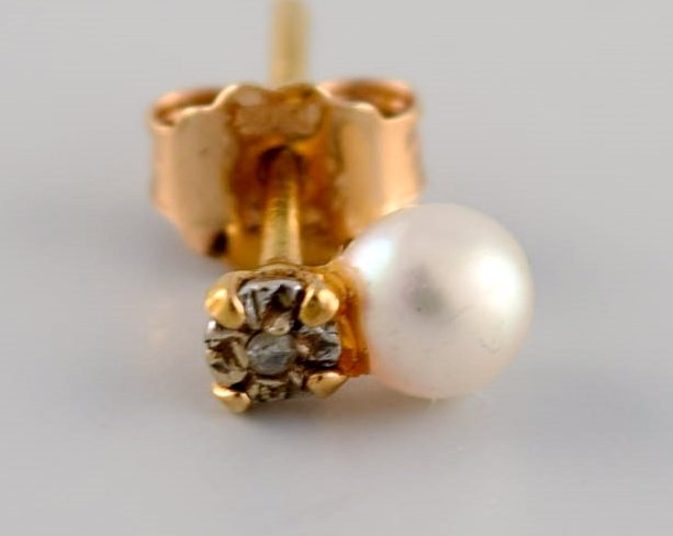 Swedish jeweler. A pair of classic ear studs in 18 carat gold adorned with cultured pearls and semi-precious stones. Mid-20th century. Measures: 12 x 7 mm. In excellent condition. Stamped.