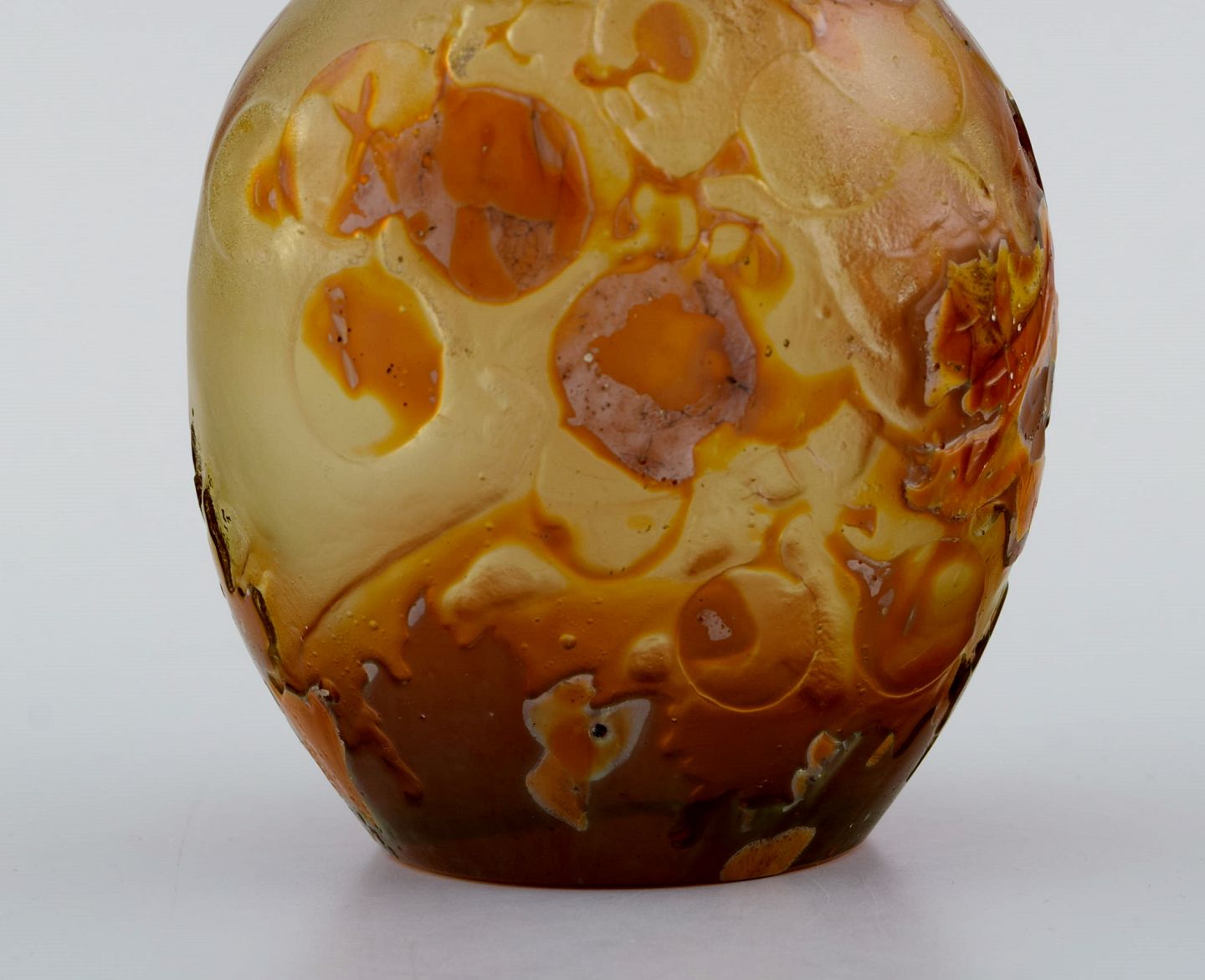 Antik Emile Gallé vase i matteret kunstglas med overfang af ravfarvet kunstglas udskåret med motiver i form af bær og bladværk. Museumskvalitet, 1890'erne. Måler: 17,5 x 10 cm. I flot stand. Stemplet.