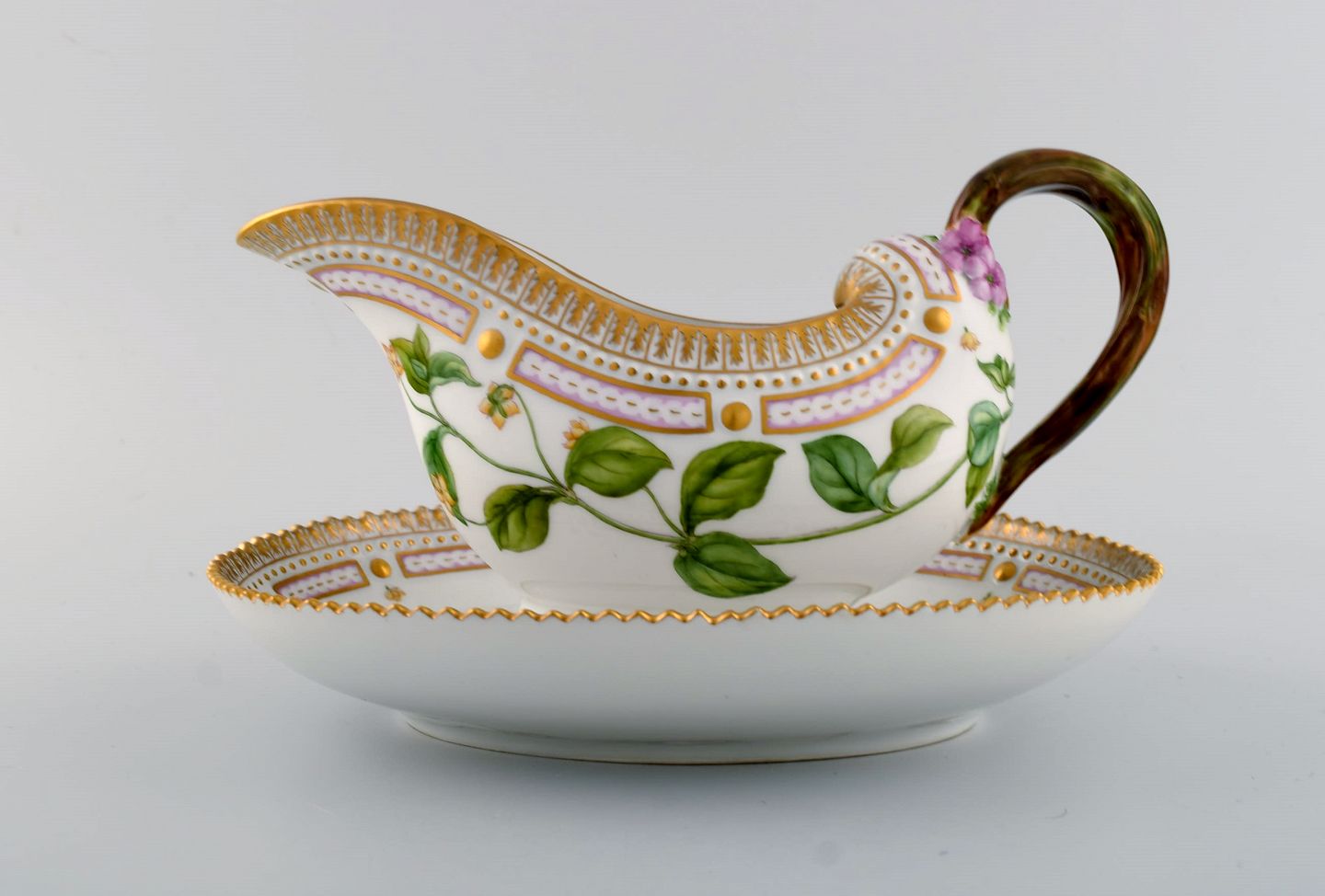 Royal Copenhagen Flora Danica sauce boat in hand-painted porcelain with flowers and gold decoration. Model number 20/3556. Measures: 25 x 17 x 13 cm. In perfect condition. 1st factory quality. Stamped.