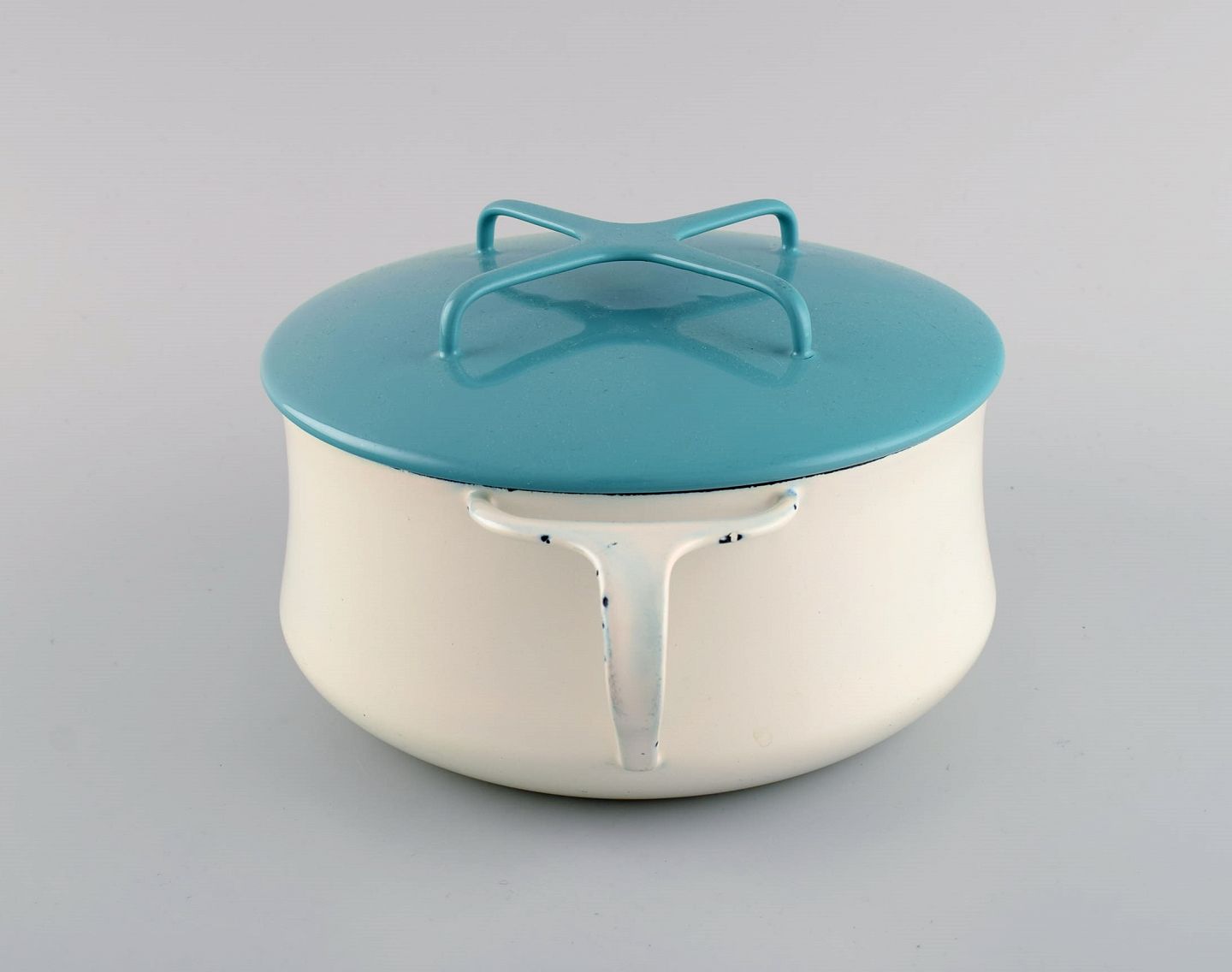 Jens H. Quistgaard: Gryde med låg i turkis og cremefarvet emalje. 1960'erne. Måler: 26 x 13 cm. I flot stand.