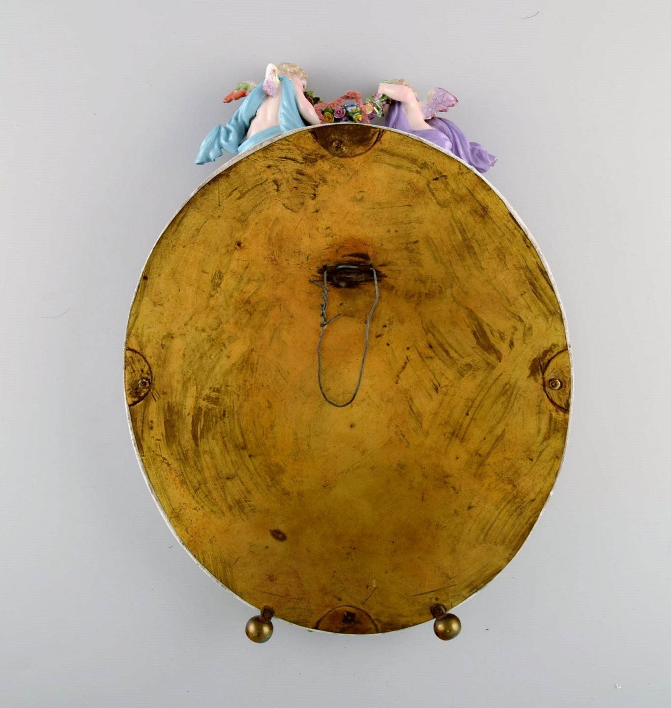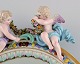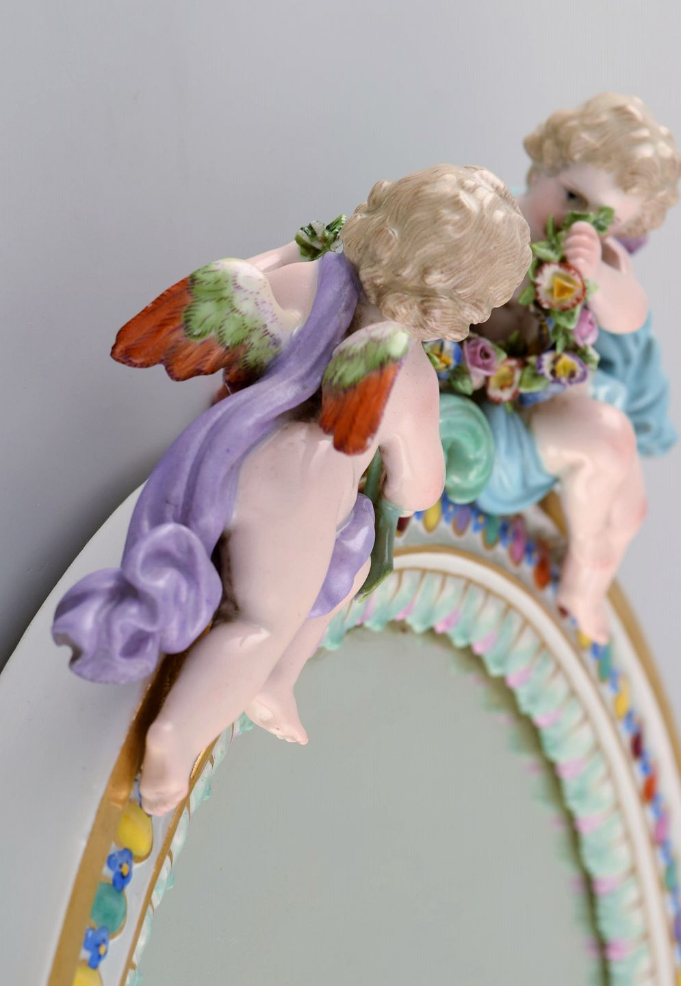 Antique Meissen porcelain mirror with original glass. Decorated with angels and repousse flowers. Approx. 1900.