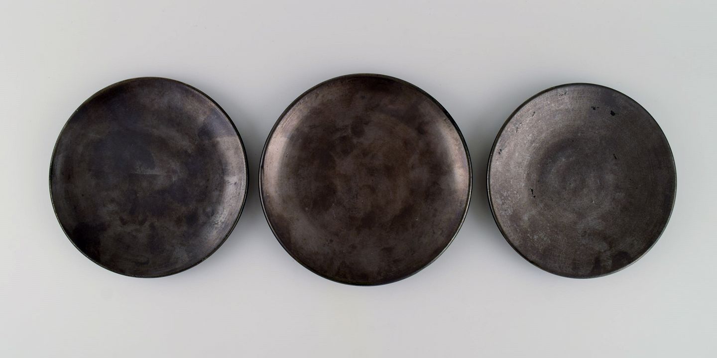 Suzanne Ramie (1905-1974) for Atelier Madoura. Fem unika tallerkener i glaseret stentøj. Smuk sort metallisk glasur. Midt 1900-tallet.