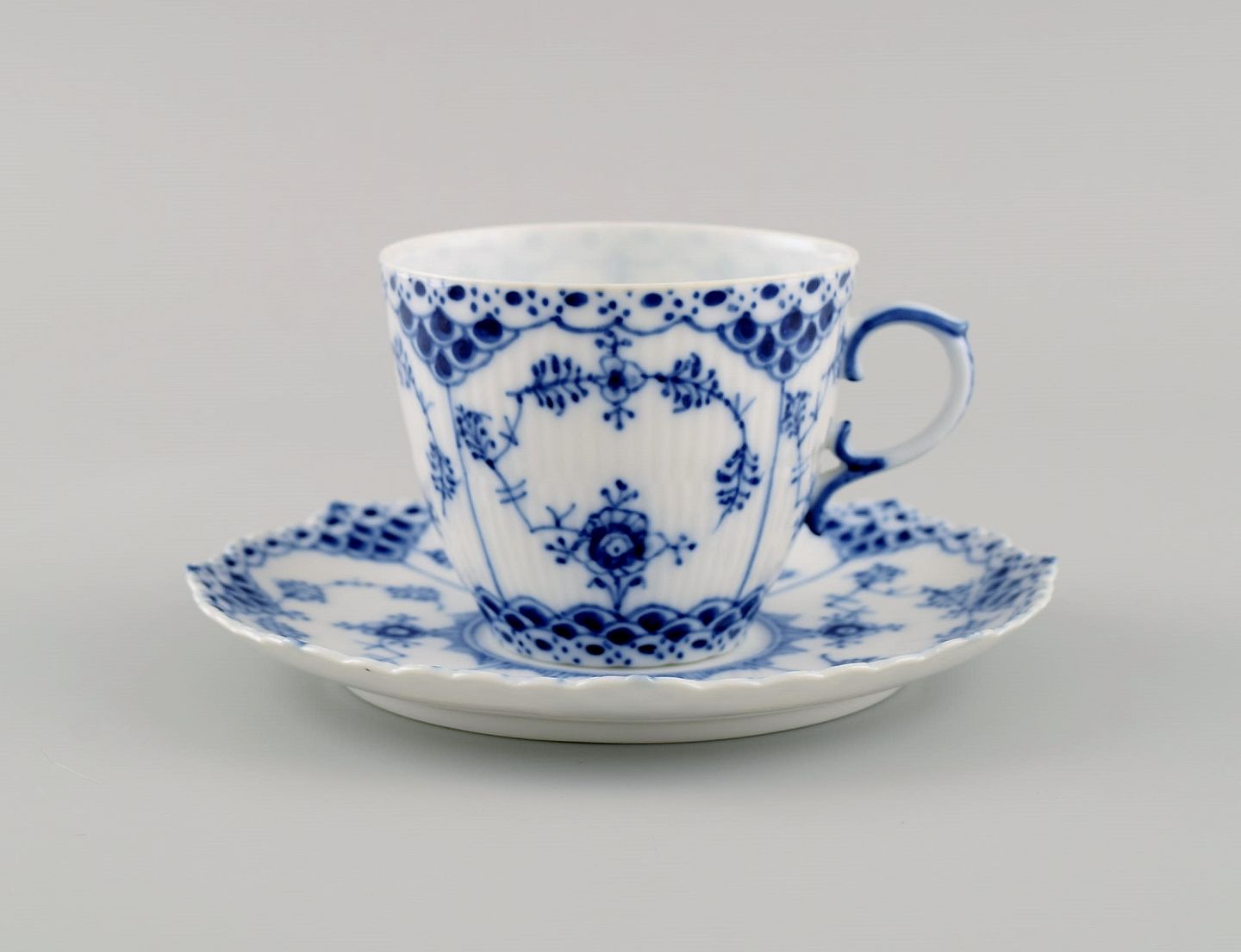 12 Royal Copenhagen Blue Fluted Full Lace Coffee Cups with saucers # 1/1035. 1st factory quality. In perfect condition. Stamped. Cup measures: 7 x 6 cm. Saucer measures: 13.5 cm.