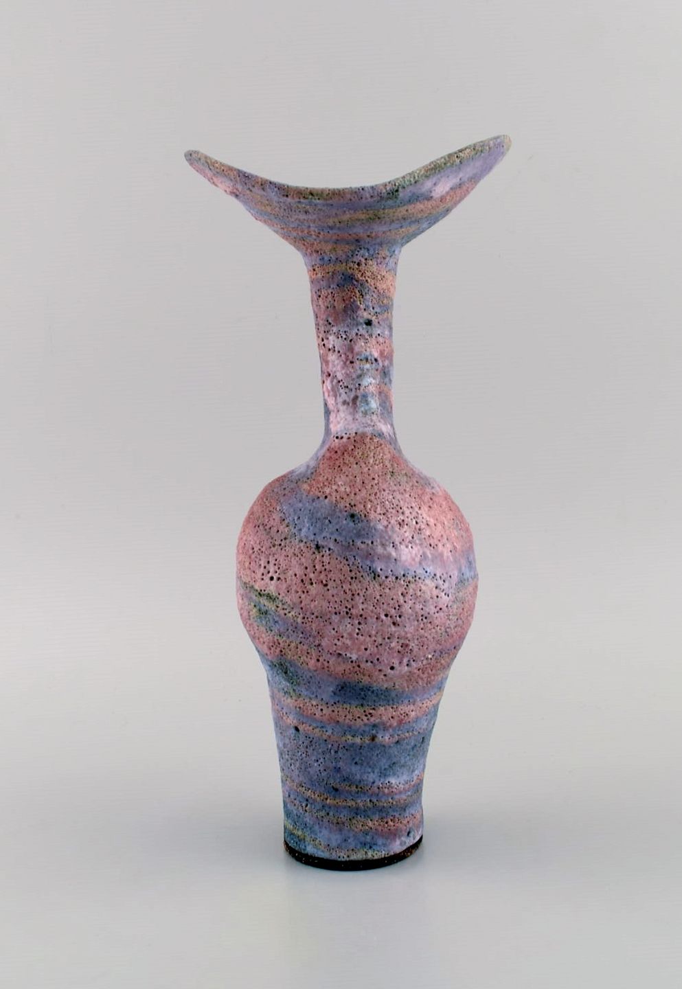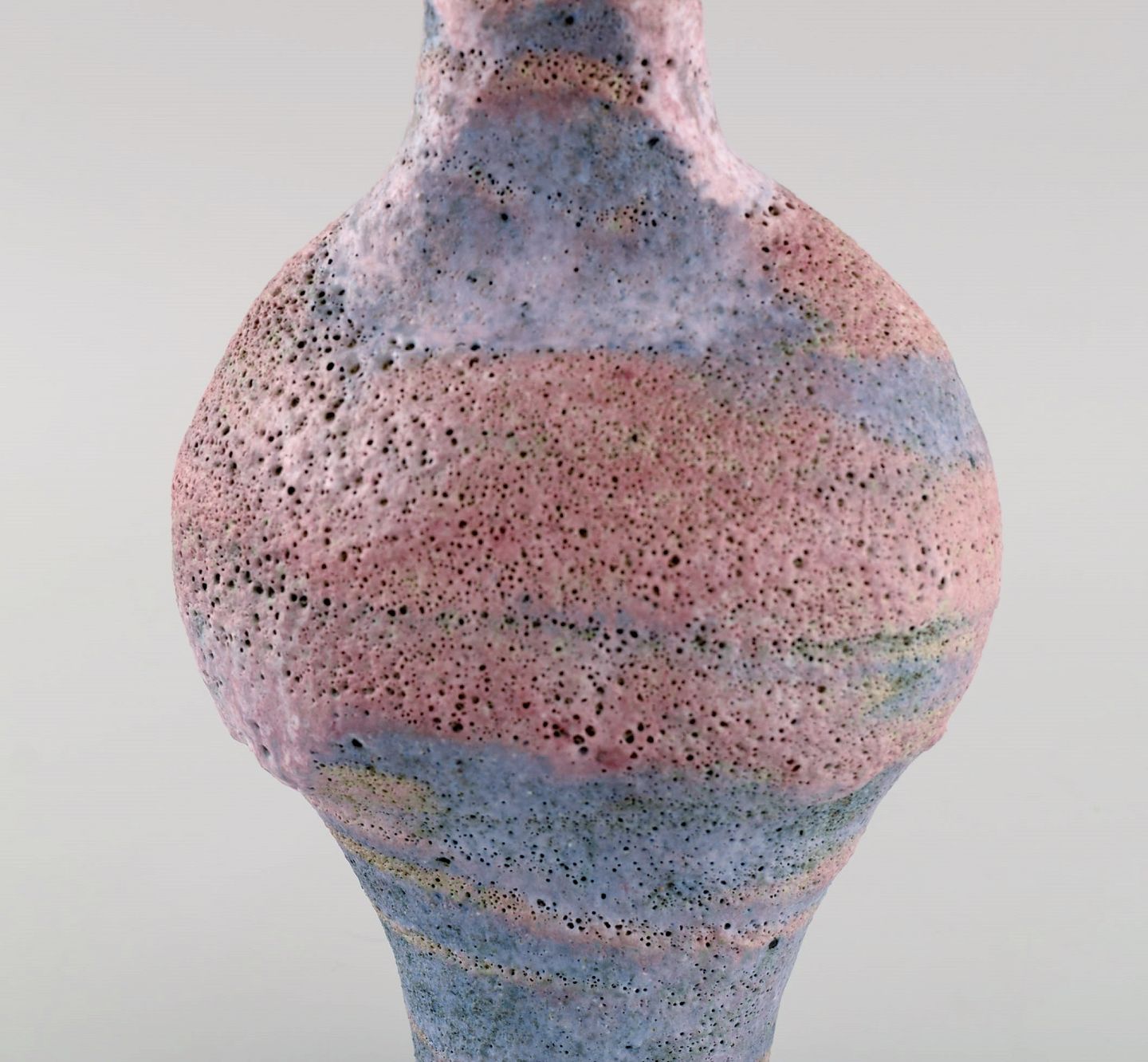 Lucie Rie (b. 1902, 1995), Austrian-born British potter. Large modernist unique vase in glazed ceramics / stoneware. Beautiful glaze in pink and purple shades. Trumpet shaped mouth. Museum quality. Own workshop, ca. 1980.