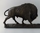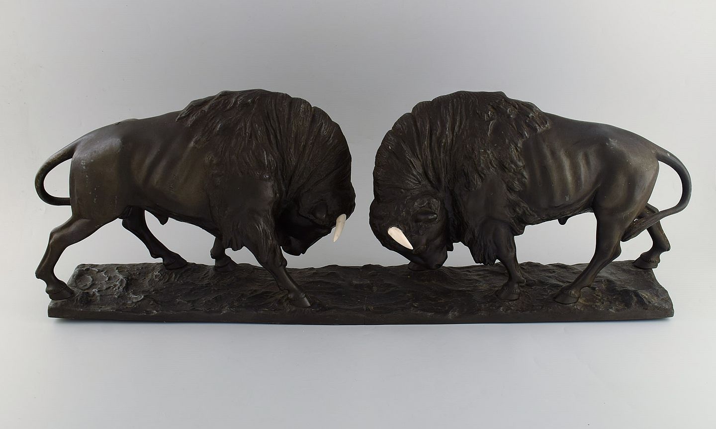 Peder Marius Jensen (1883 - 1925), Danish sculptor. Colossal sculpture in patinated bronze. Fighting bisons. Horns made of bone. Early 20th century.