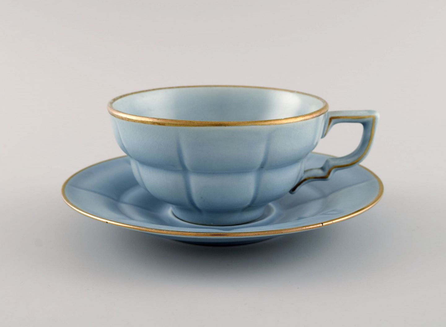 Arthur Percy for Upsala-Ekeby / Gefle. Complete art deco Grand tea service in pastel blue porcelain with hand-painted gold edge for five people. 1930s / 40s.