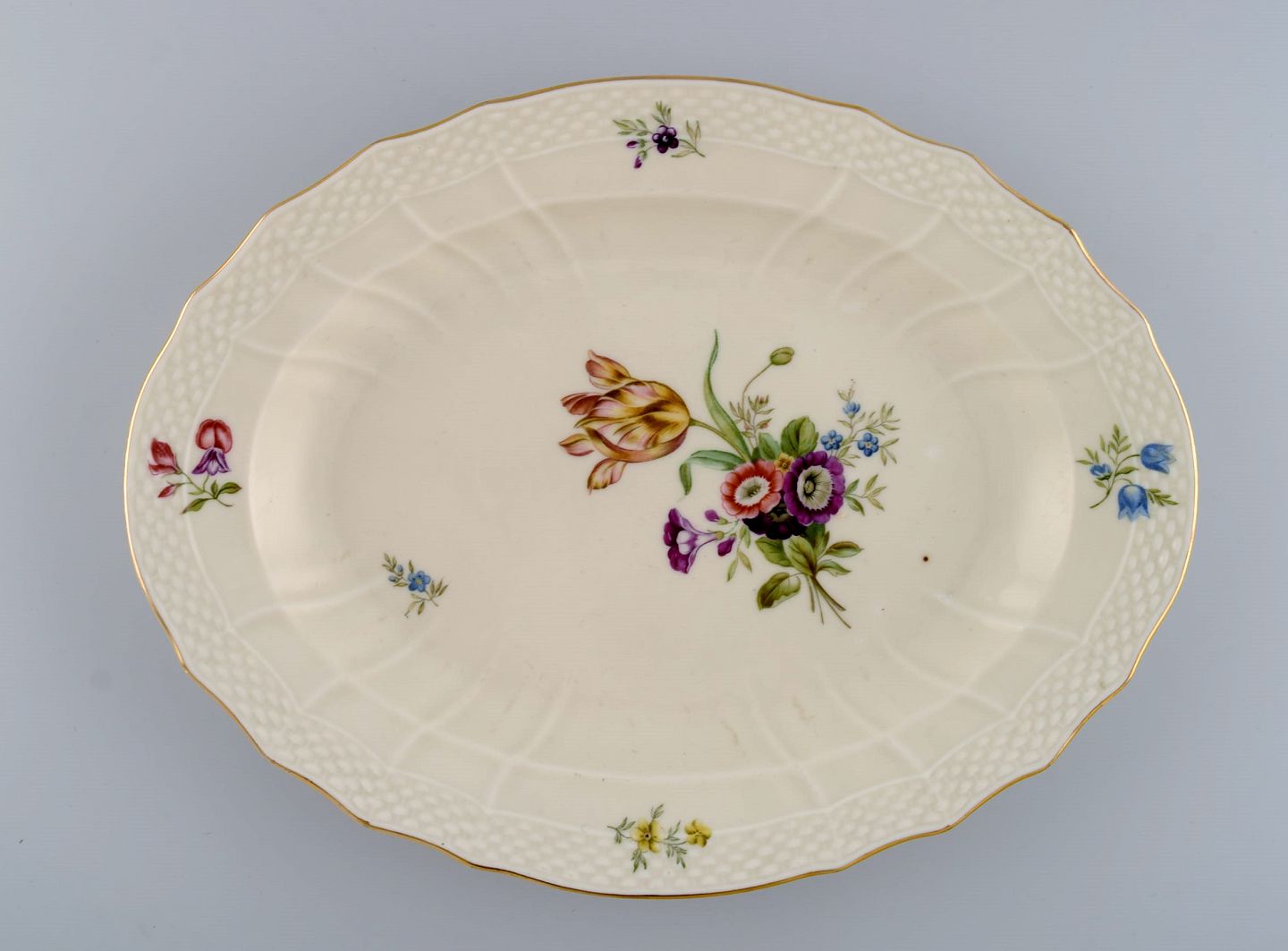 To Royal Copenhagen Frijsenborg serveringsfade i håndmalet porcelæn med blomster og guldkant. 1950'erne. Største måler: 37 x 29,5 x 4 cm. I flot stand. Stemplet. 3. Sortering.