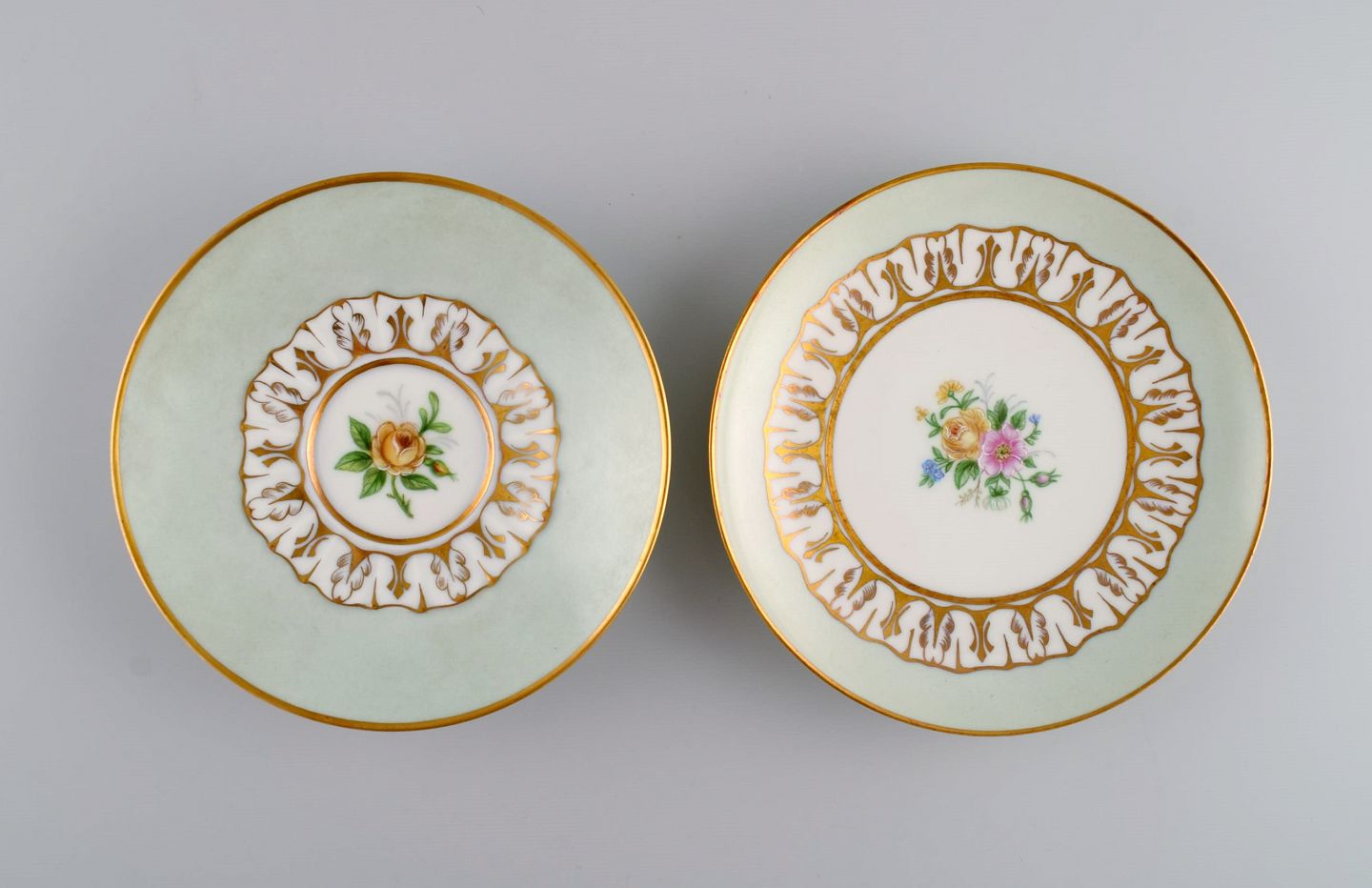 Bing & Grøndahl coffee service for four people. Flowers and gold decoration on light green background. 1960s.