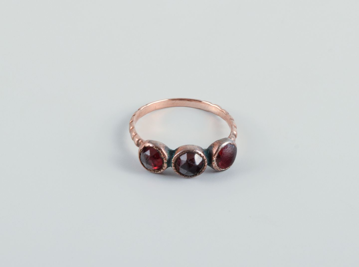 Skandinavisk guldsmed, ældre guldring prydet med tre rød sten. 1920/30erne. Ustemplet. Målt til 14 karat. Ringstørrelse 15mm.