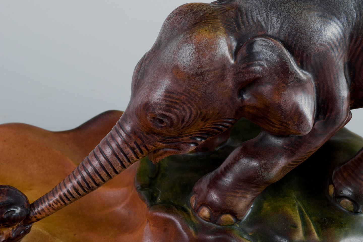 Ipsens Enke, Elefant og krokodille. Figur af keramik, glasur i orangegrønne nuancer.
