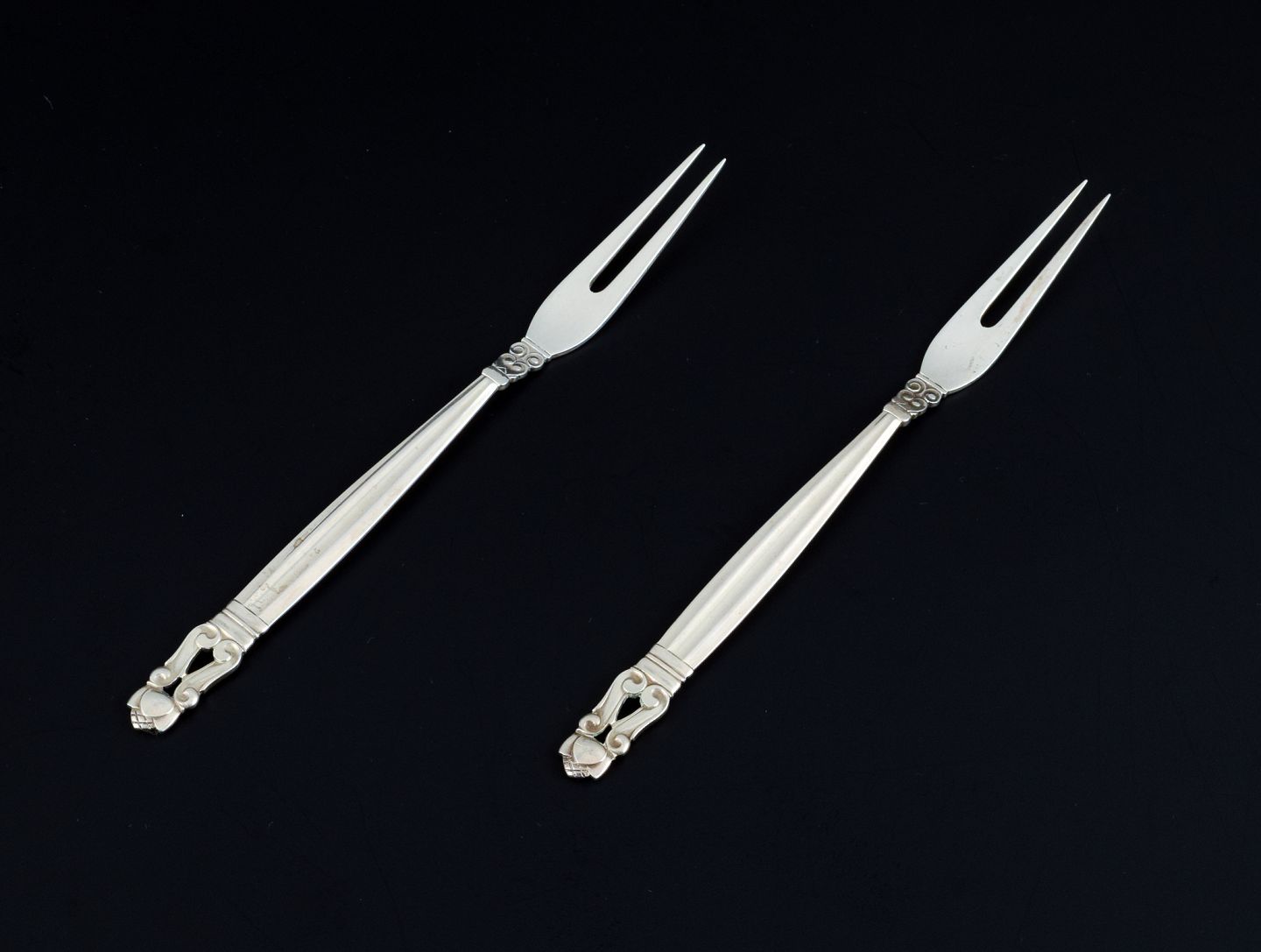 Georg Jensen, Acorn, two cold cuts forks in sterling silver. Stamped after 1945. In perfect condition with minimal signs of use. Measurements: L 16.6 cm.