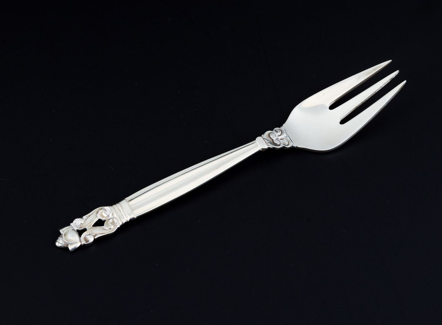 Georg Jensen Konge, fiskebestik til fem personer i sterlingsølv. Fiskekniv og fiskegaffel. Stemplet efter 1945. I perfekt stand med minimalt brugspræg. Kniv: L 20,5 cm. Gaffel: L 16,5 cm.