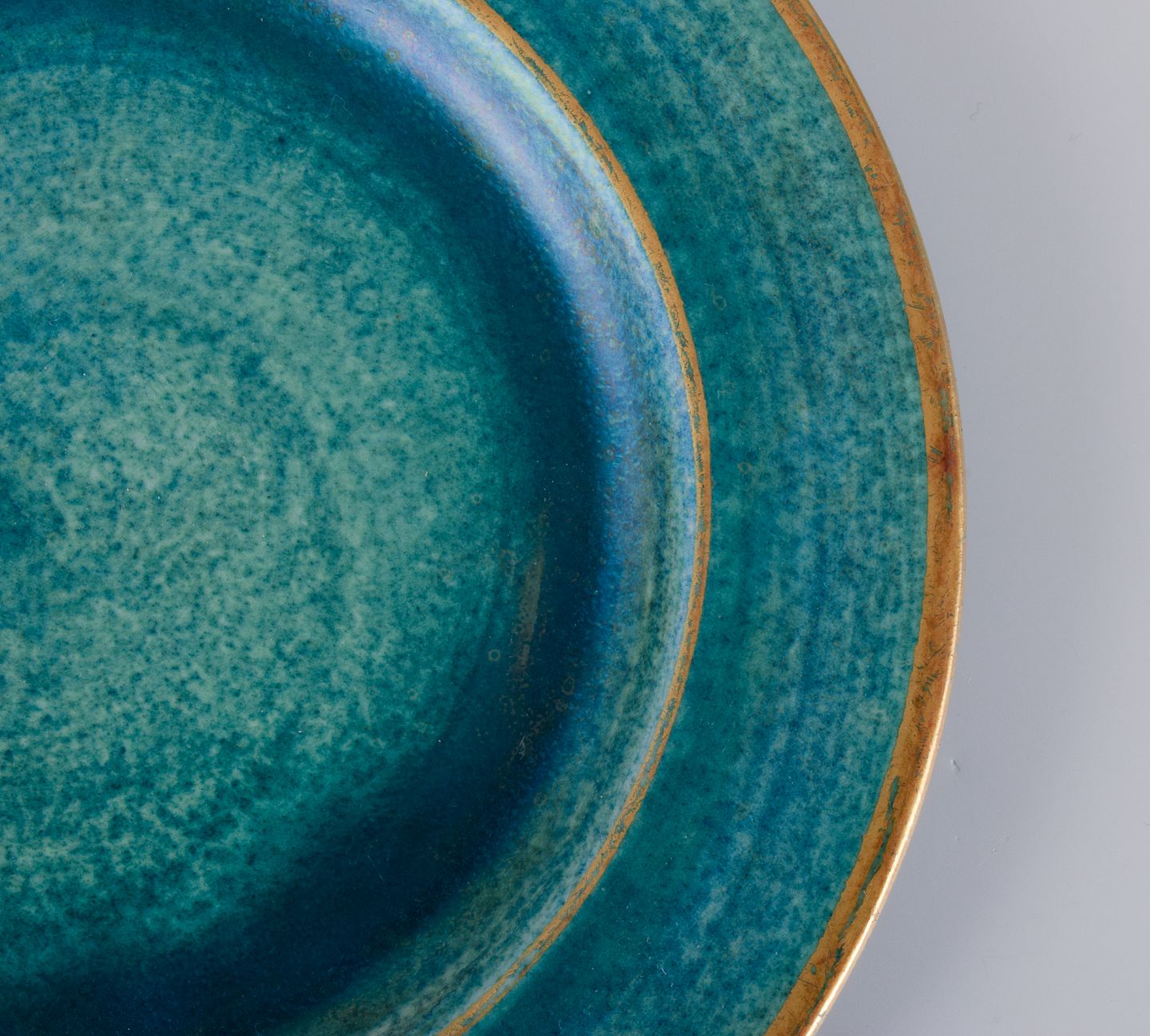 Josef Ekberg for Gustavsberg, Sverige. Et sæt på ti tallerkner i keramik. Glasur i blågrønne toner med guldkant. Midt 1900-tallet Stemplet. Perfekt stand. Mål: D 18,5 cm.