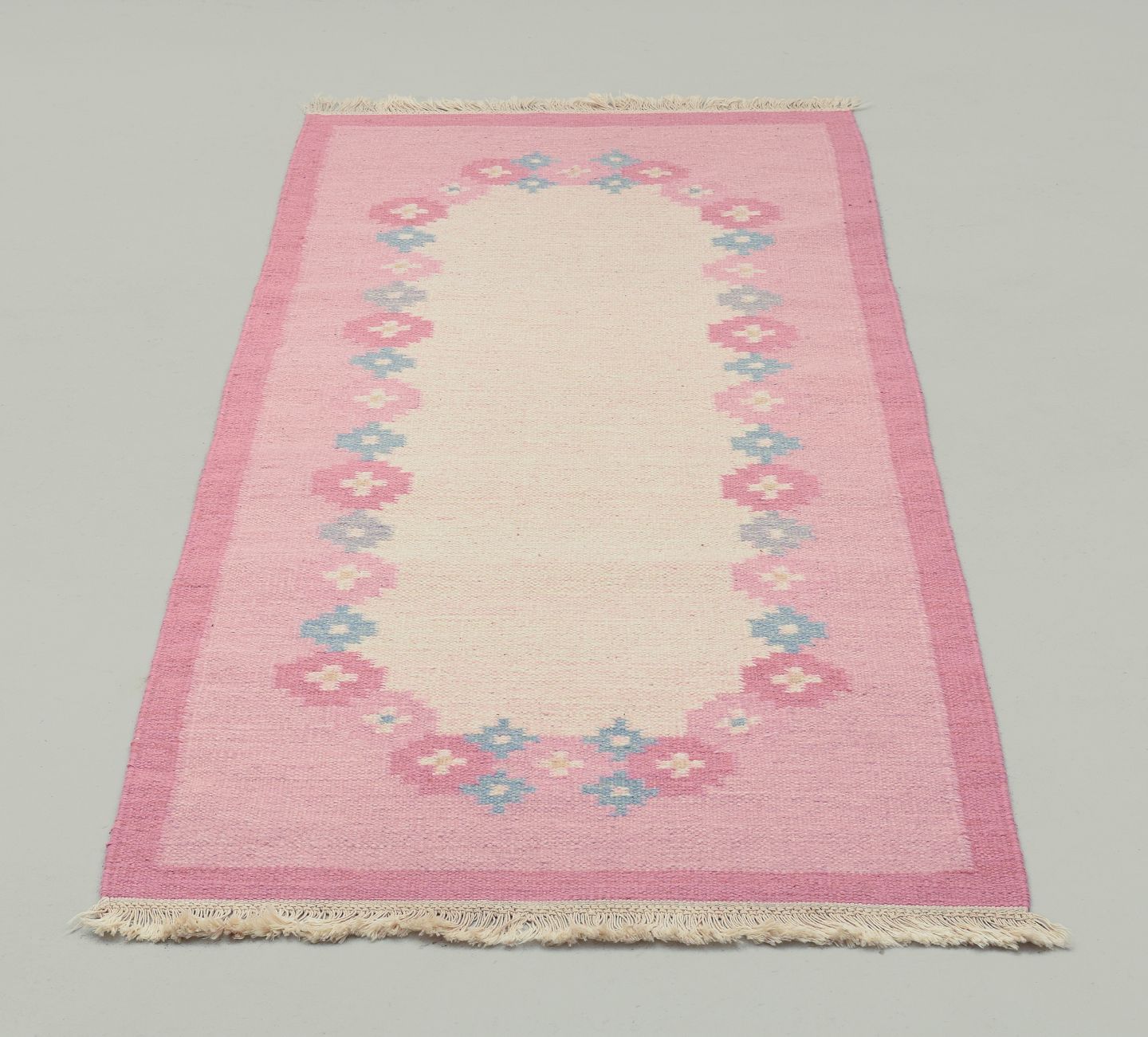 Svensk tekstildesigner. Håndvævet løber i ren uld. Rölakan-teknik. Geometrisk mønster. Lyserøde, blå og hvide farver. Midt 1900-tallet. I flot stand med minimalt brugspræg. Mål: 211 cm. x 84 cm.
