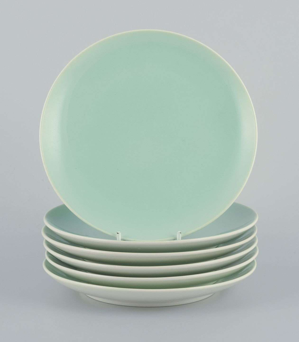 Seks Aluminia "Confetti" tallerkener i mintgrøn glaseret fajance. Midt 1900-tallet. I flot stand, med naturlige krakeleringer. Stemplet. Første sortering. Diameter: 19,8 cm.