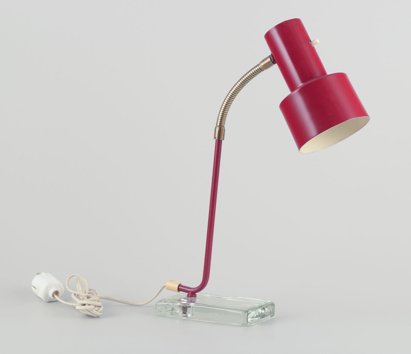 Retro table lamp in red lacquered metal on glass base.