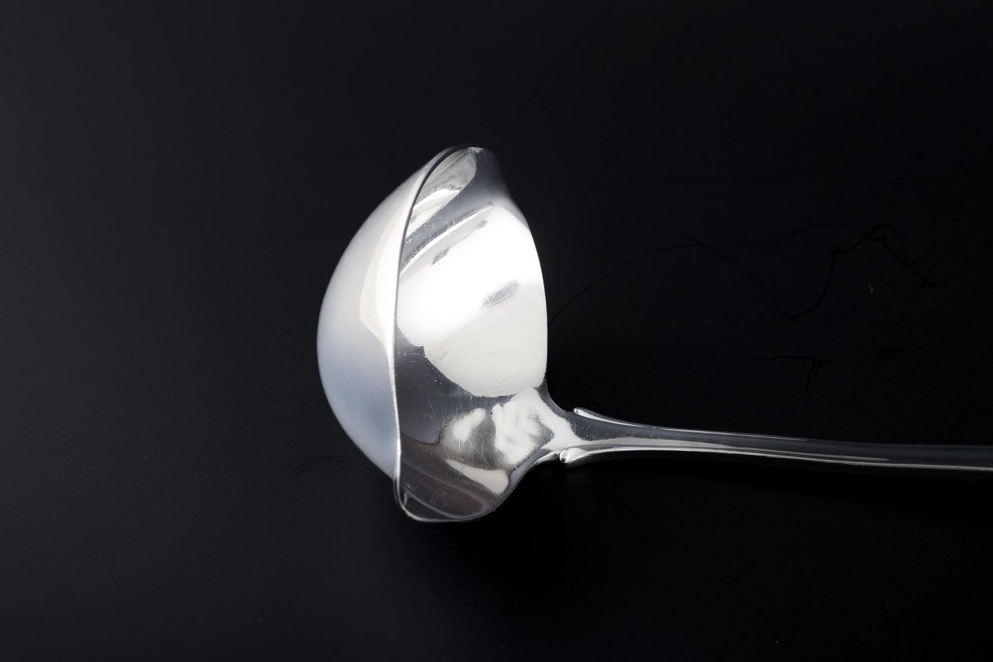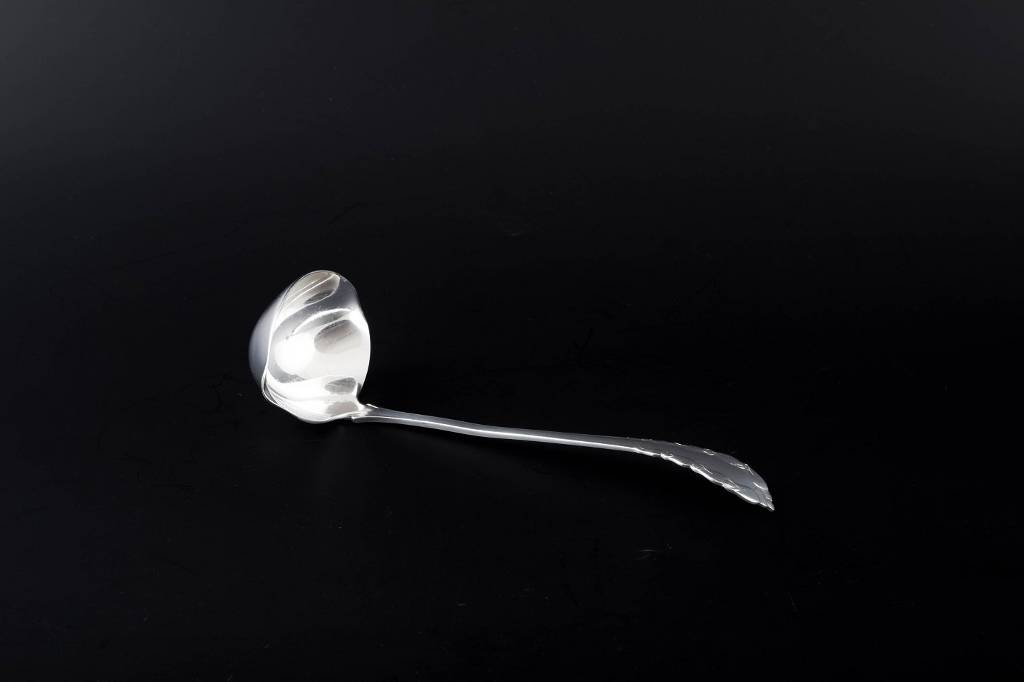 Sauce spoon in the "Lily of the Valley" pattern. Polished sterling silver with an elegant handle ending in subtle floral and leaf decoration.