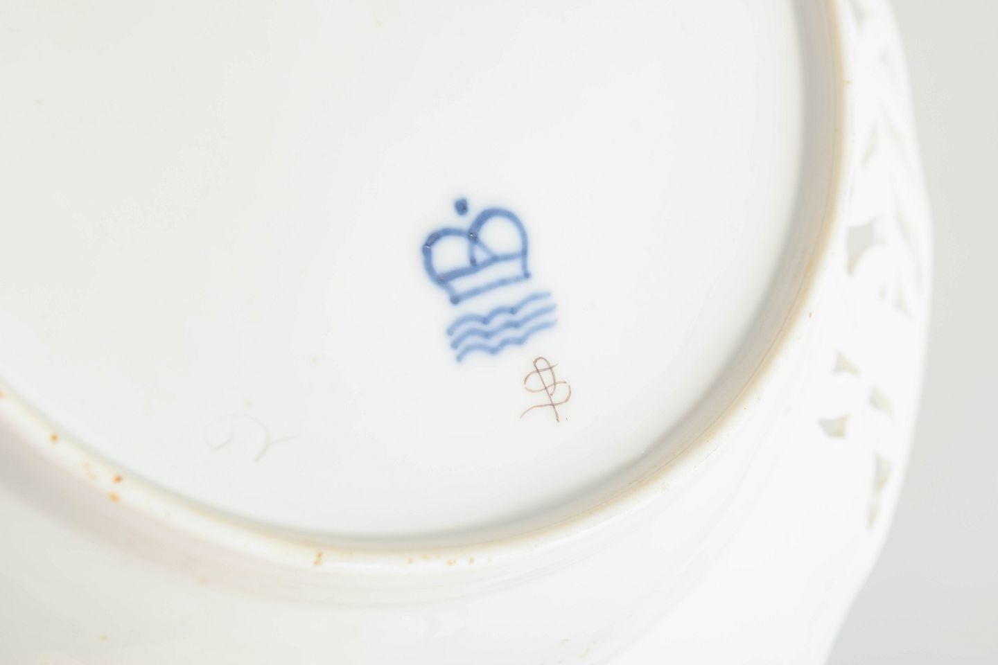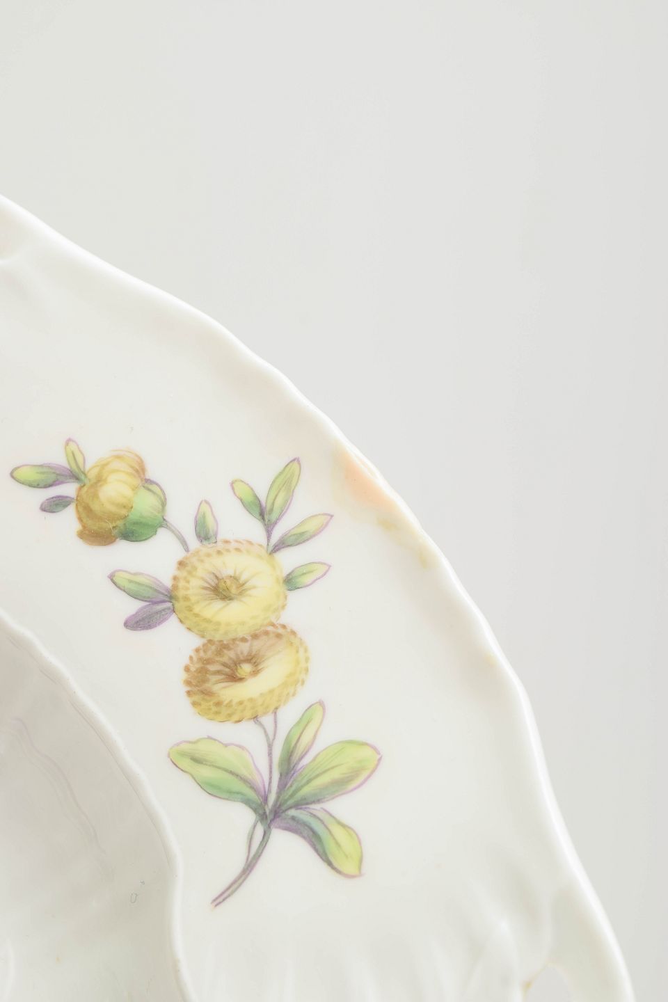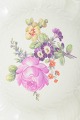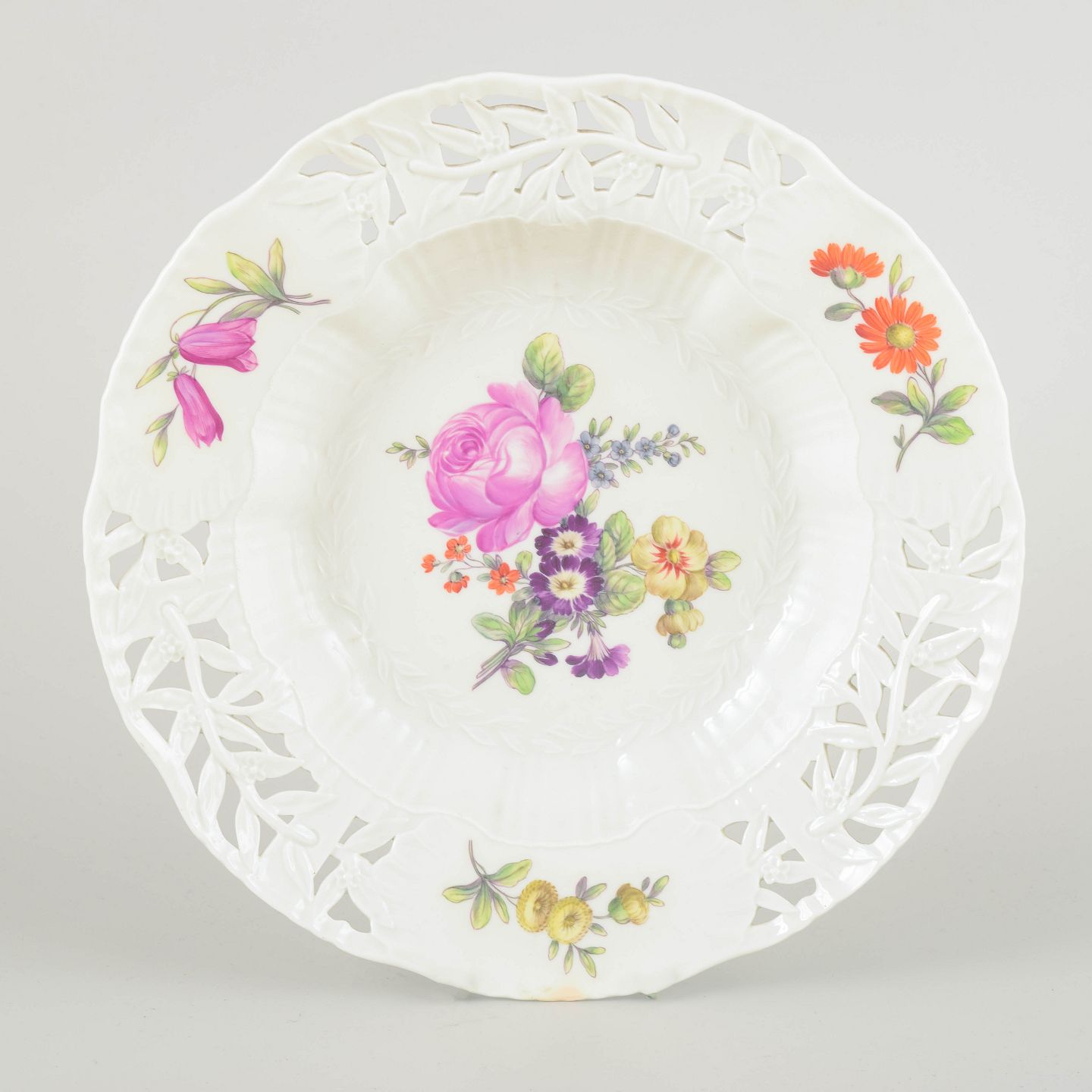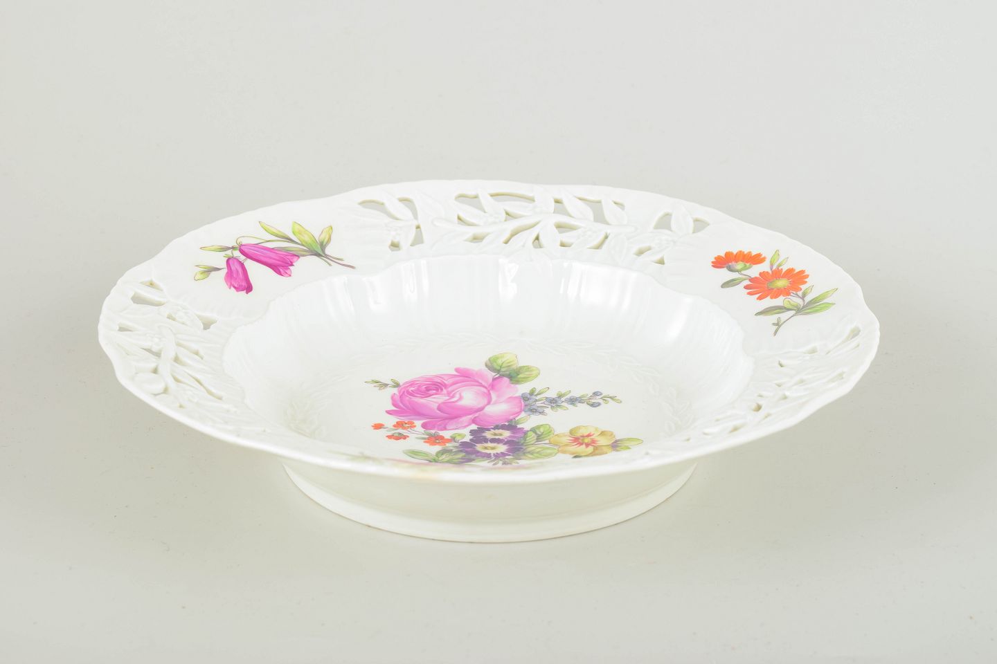 Håndmalet porcelæn med blomstermotiv i flerfarvet palet og gennembrudt bort i klassisk stil. Elegant dyb form med rigt dekoreret spejl og raffineret håndværksdetalje.