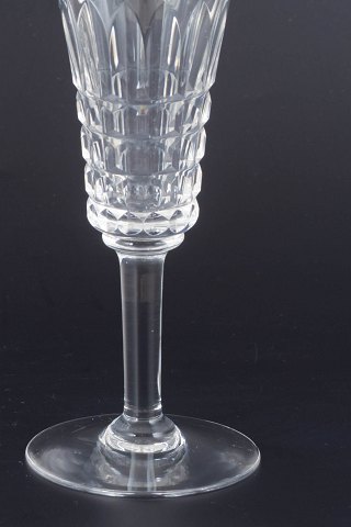 Sæt på fire franske champagneglas i klart krystal med facetteret kumme og klassisk stamme. Form og slibning giver et elegant lysspil og et tidstypisk udtryk fra midten af det 20. århundrede.