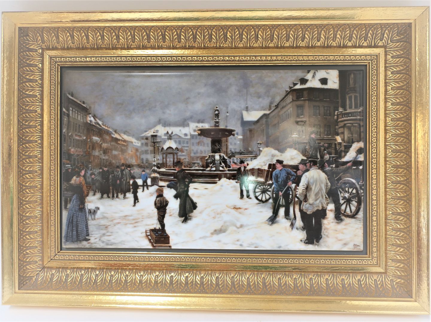 Bing & Grøndahl. Porcelæn maleri. Motiv af Paul Fischer. Vinterdag på Gammeltorv. Størrelse inklusiv ramme, 47*33 cm. Produceret 1750 styk. Dette har nummer 921.