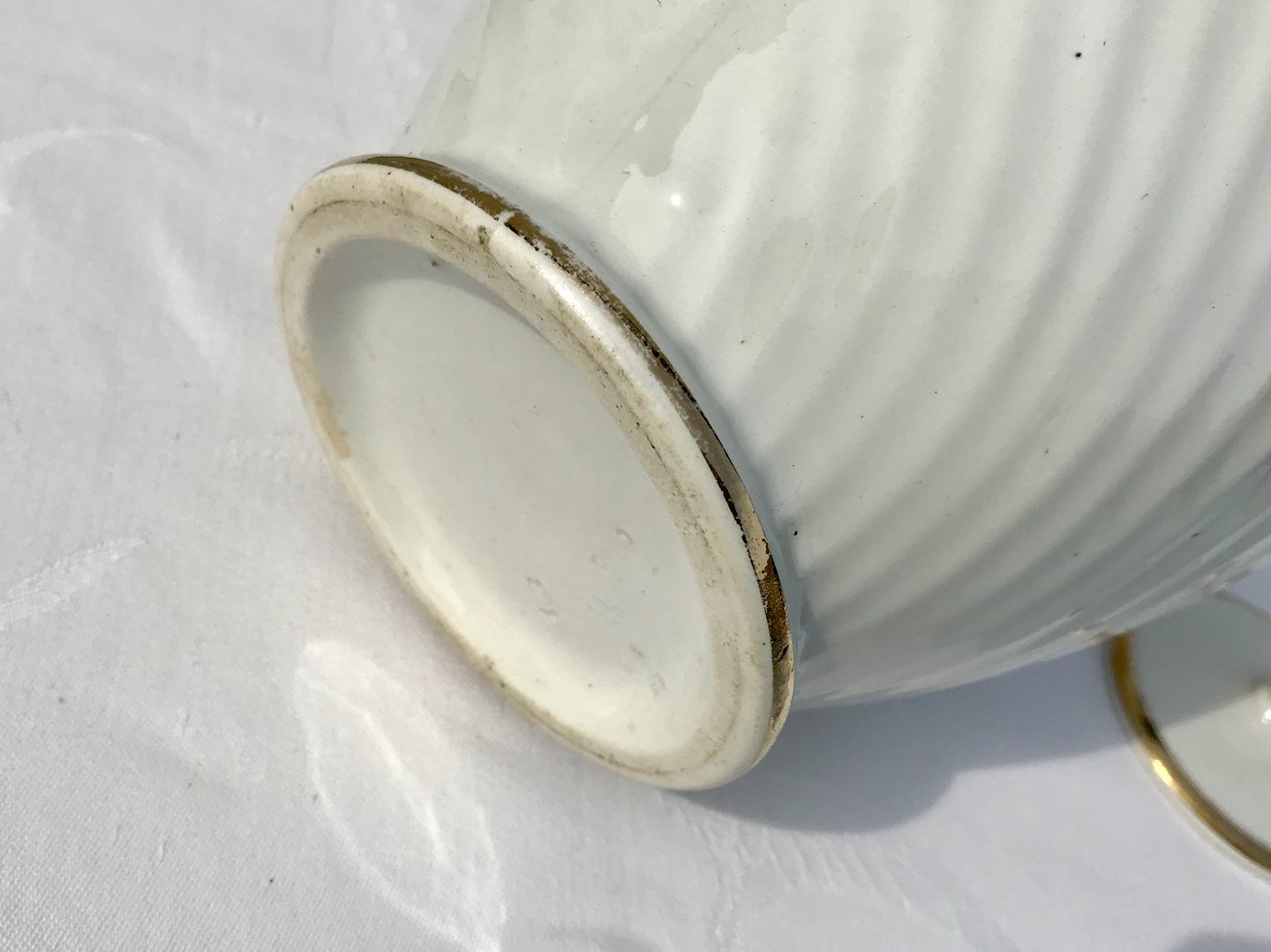 Chocolate jug, with lion and optical stripes and gold decoration, 25cm high, 16cm wide * Worn in the gold and small notch in the lid *