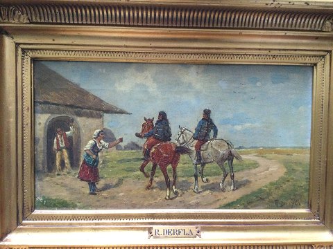 Anton Rudolf Derfla (født 1849): 2 malerier med Bosniske Husarer på stop ved huse på vejen. Olie på plader Det ene sign.: R.D. - det andet sign.: R. Derfla Messingskilte - R: DERFLA 17x31 (28x42)