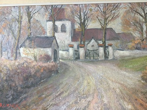 Verner Trokner (1910-86): Parti fra Kirkebakken ved Skuldelev Kirke, Frederikssund. Før afrensningen i 1970'erne. Olie på plade. Sign.: V. Trokner. 35x75 (42x82)