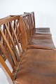 SolgtSæt af seks spisestuestole af mahogni og polstret med brunt patineret læder fremstillet af Fritz Hansen i 1940erne. Stolene er i flot brugt stand.