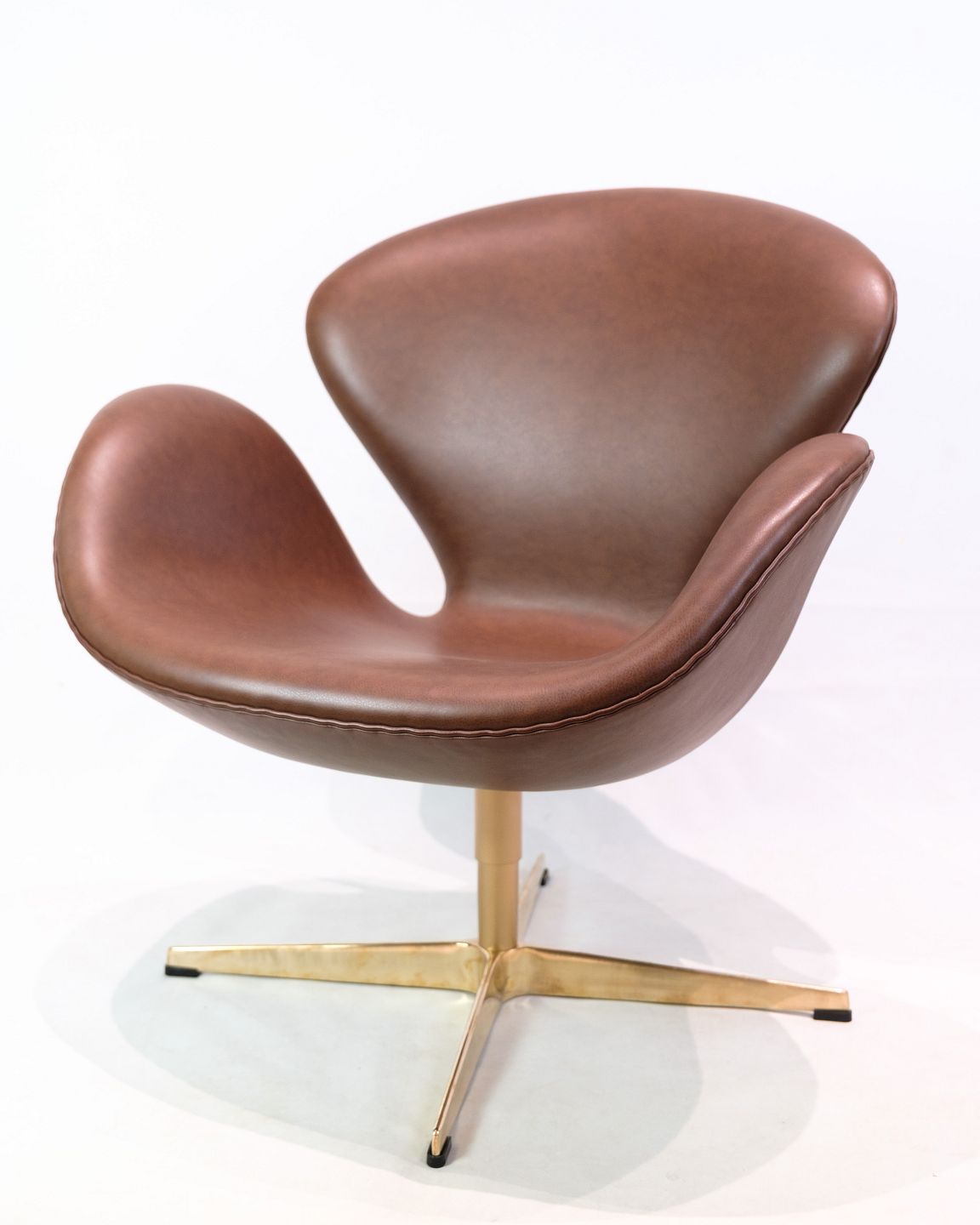 Svanen, model 3320 fremstillet af Fritz Hansen og designet af Arne Jacobsen. Den er polstret med brunt læder af høj kvalitet og har en orignal 60 års jubilæums guld søjle. Står i meget flot stand.