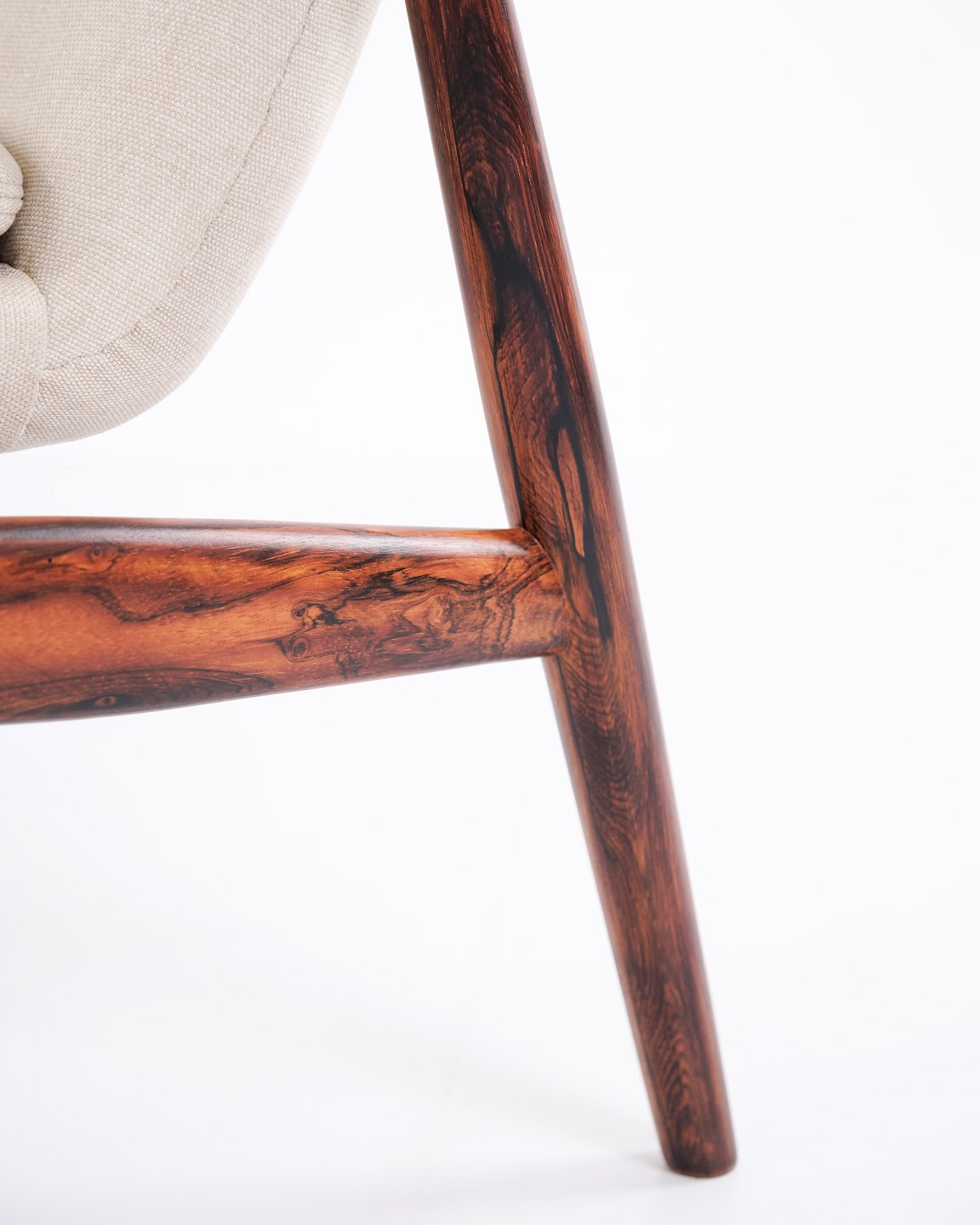Ikonisk lænestol, model NV45, designet af Finn Juhl og udført af snedkermester Niels Vodder i 1950’erne. Stolen er fremstillet i palisander med fritbærende sæde og ryg betrukket med lyst stof, hvilket fremhæver Finn Juhls karakteristiske skulpturelle formsprog og lette konstruktion.